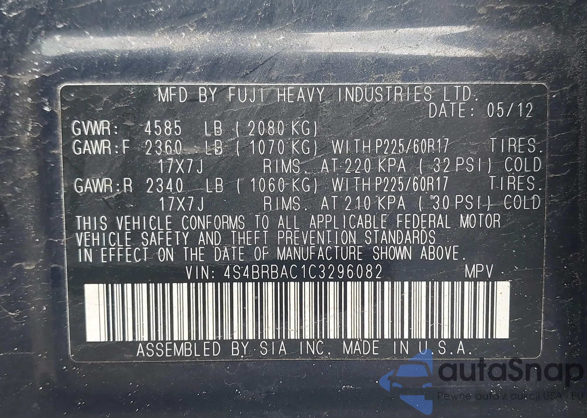 • VIN: 4S4BRBAC1C3296082