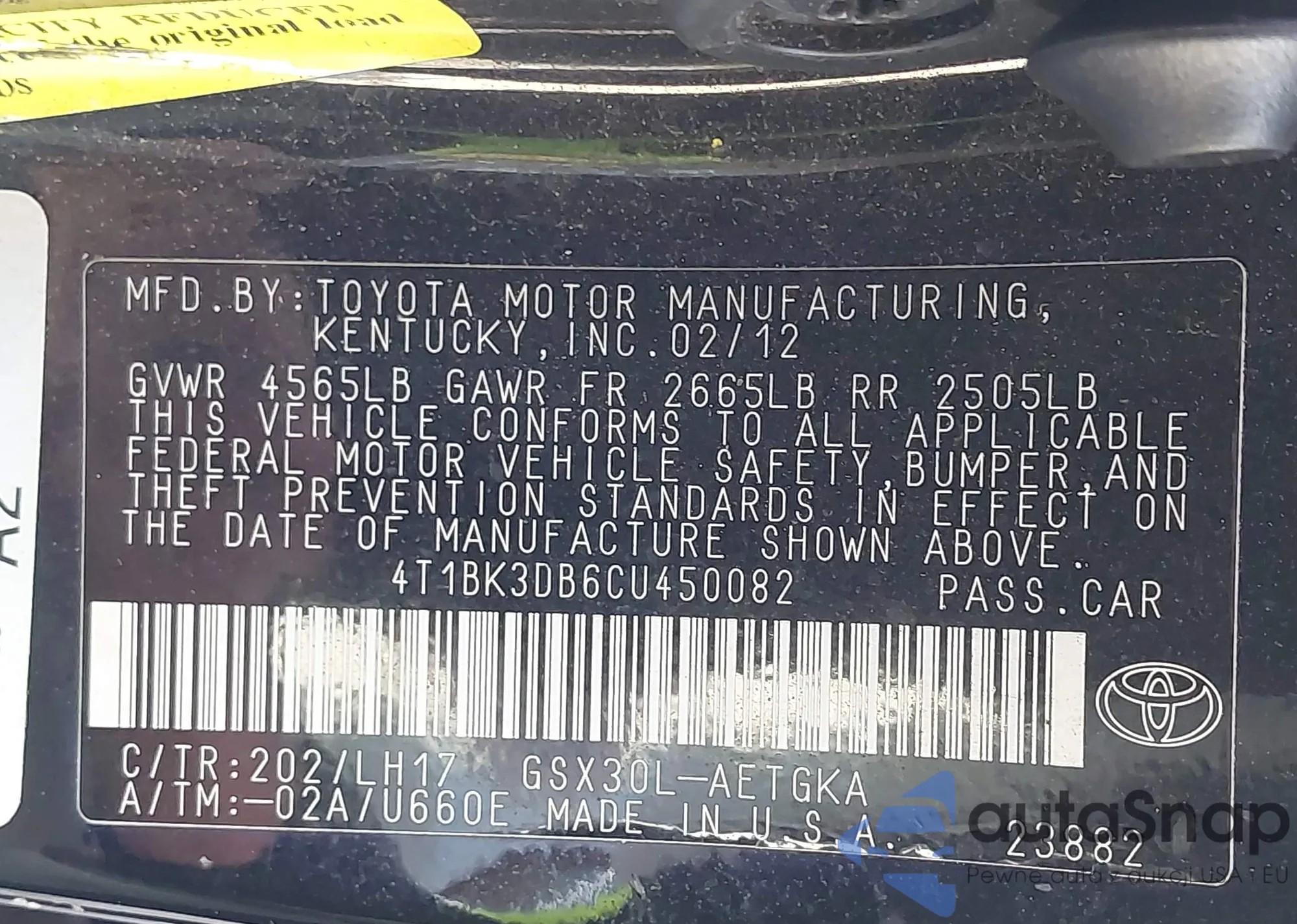 VIN: 4T1BK3DB6CU450082