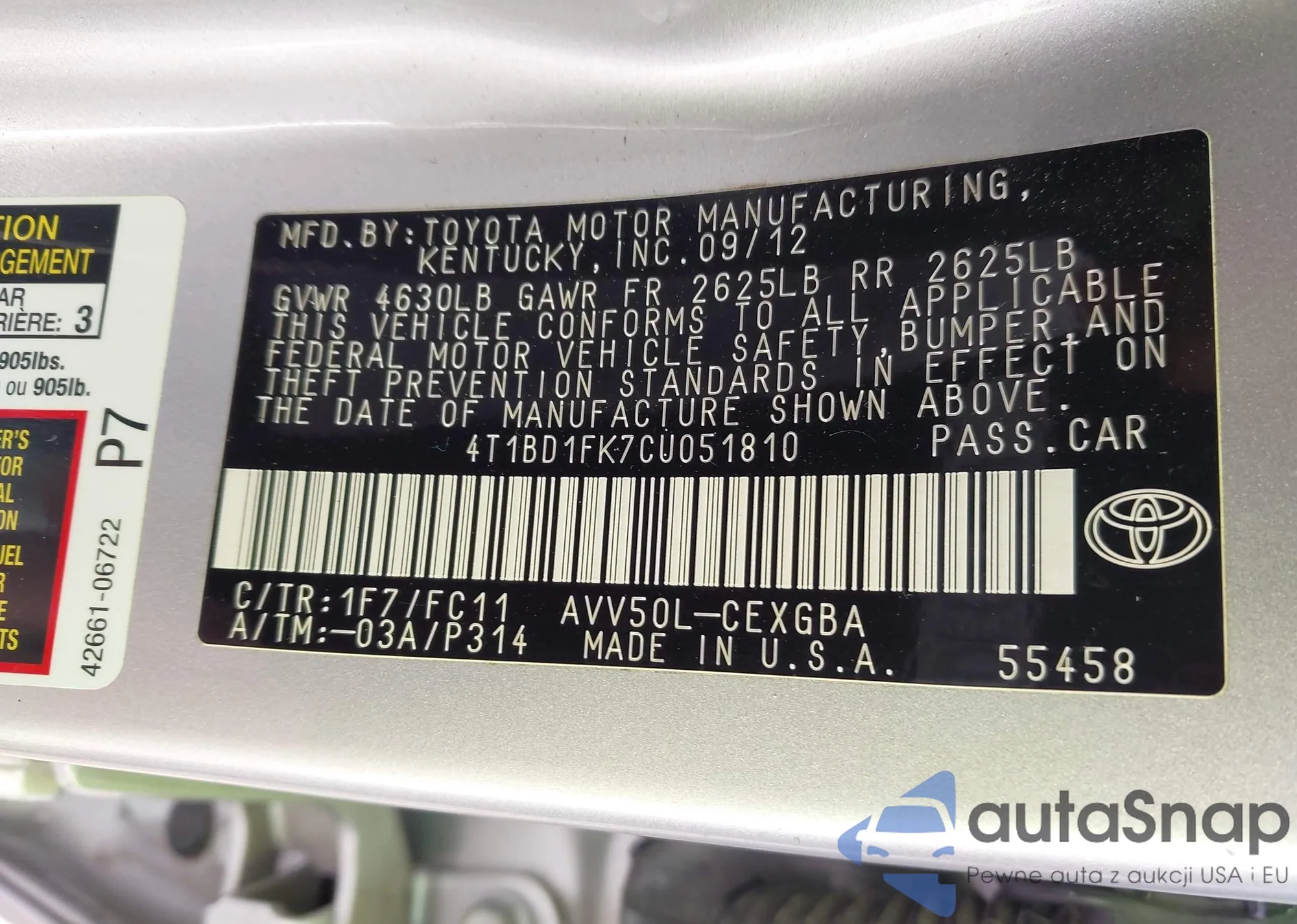 VIN: 4T1BD1FK7CU051810