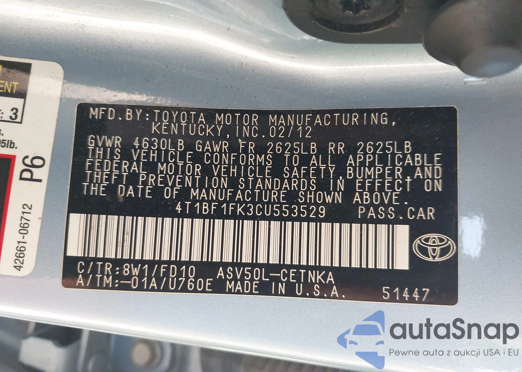 VIN: 4T1BF1FK3CU553529