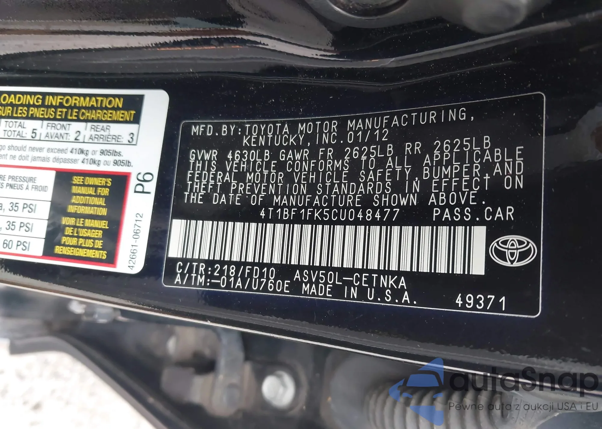 VIN: 4T1BF1FK5CU048477