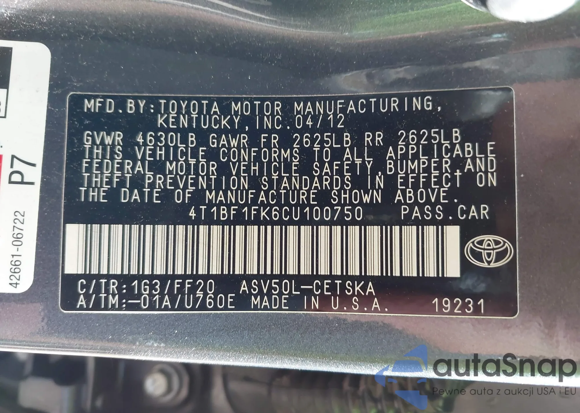 VIN: 4T1BF1FK6CU100750