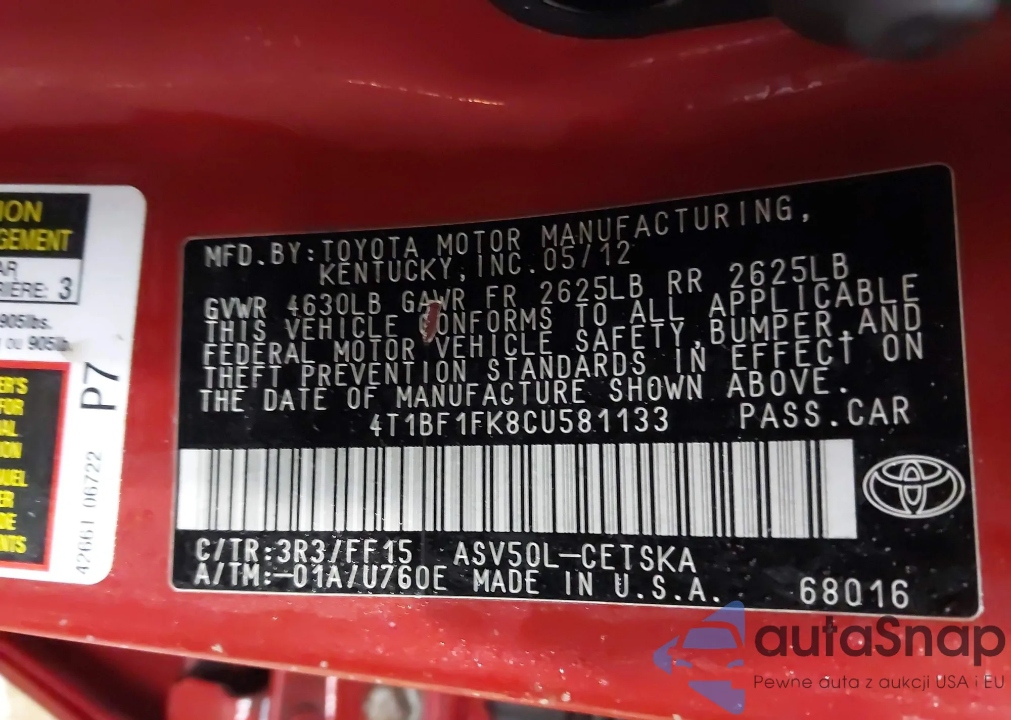 • VIN: 4T1BF1FK8CU581133