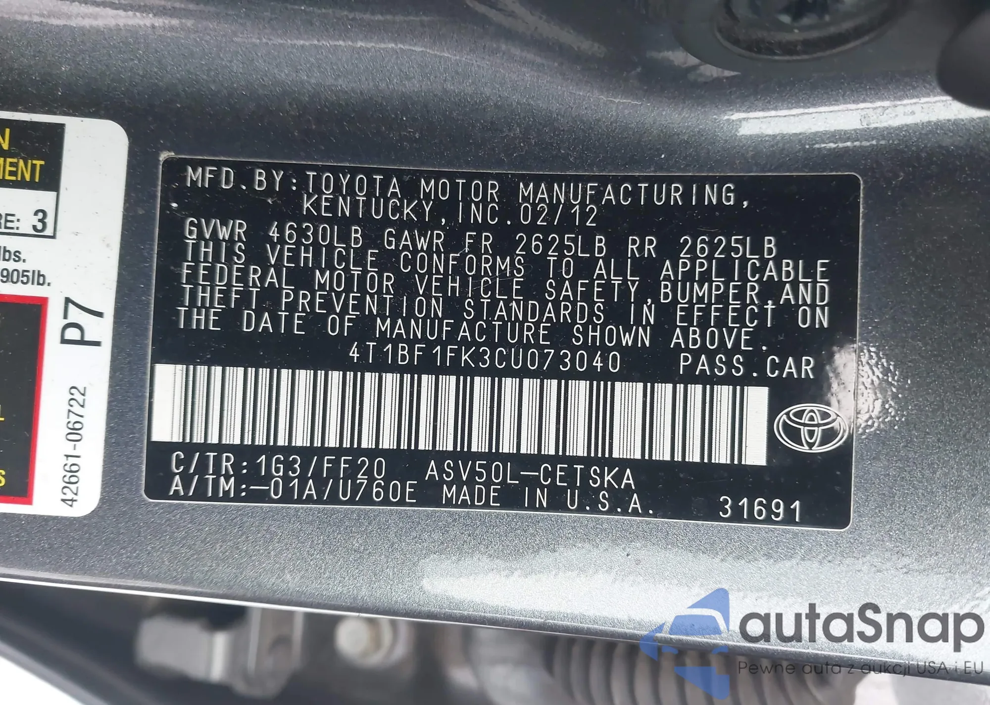 VIN: 4T1BF1FK3CU073040