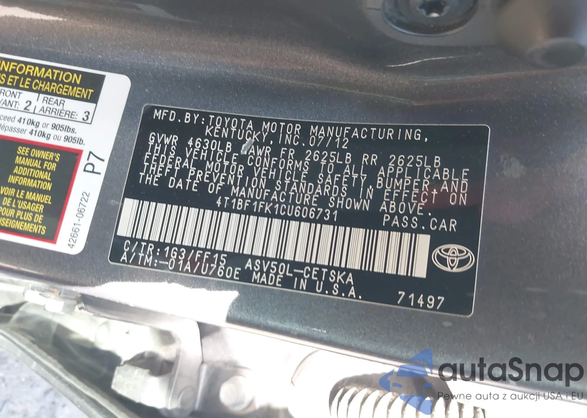 VIN: 4T1BF1FK1CU606731