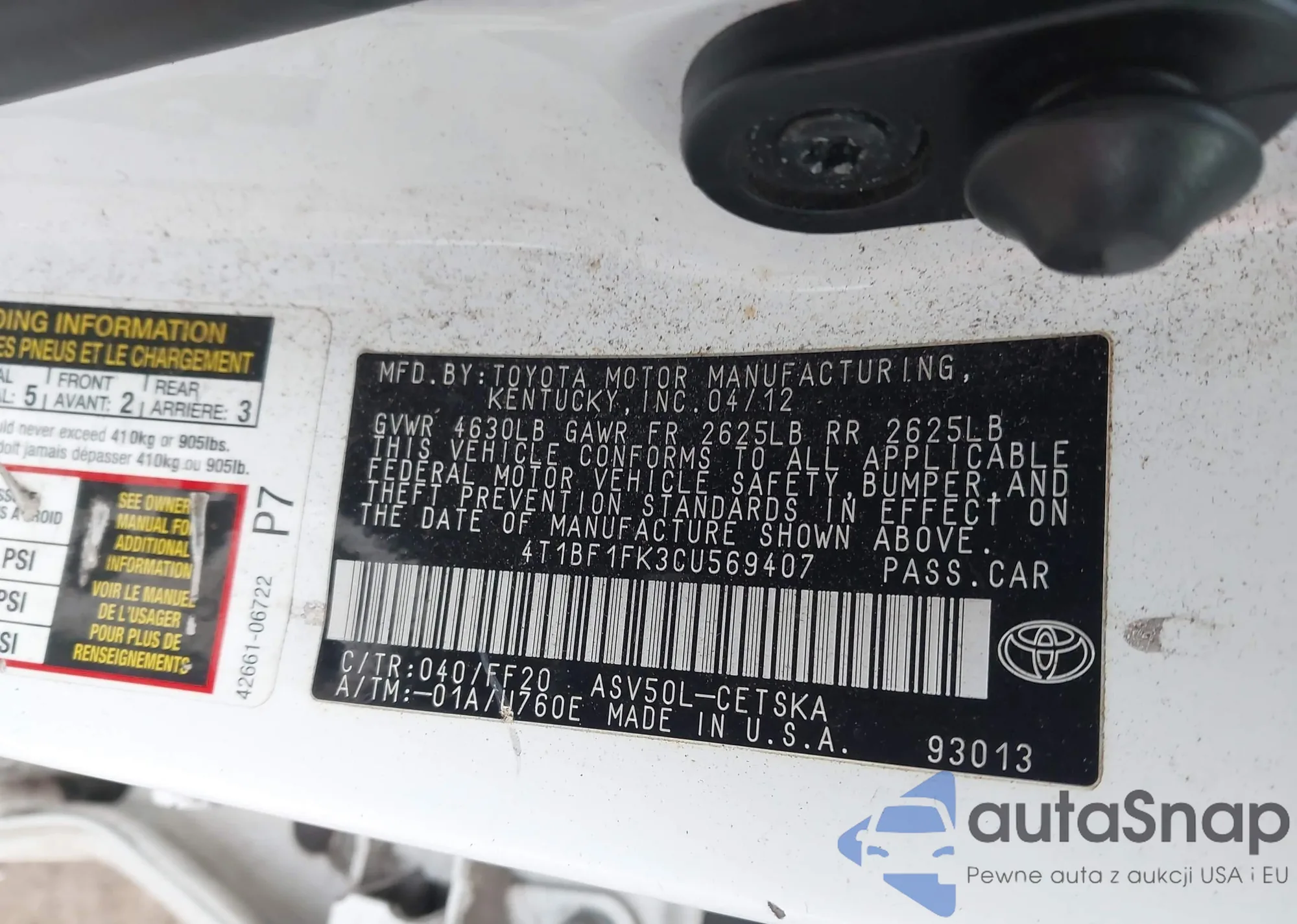 The car Toyota Camry 2012 (VIN 4T1BF1FK3CU569407) has documents that prevent registration. Export and registration may be difficult. Contact AutaSnap experts to find alternatives.