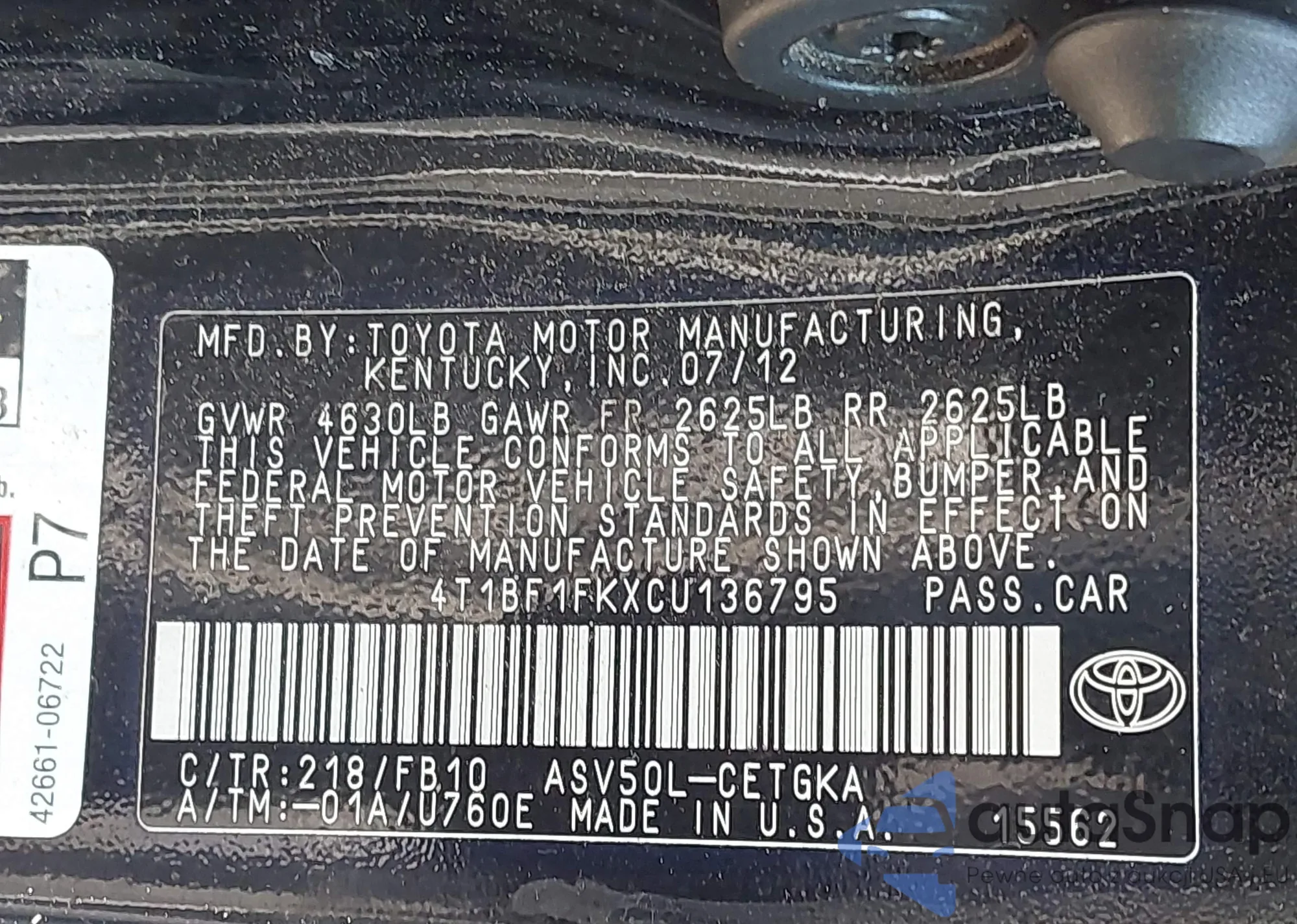 VIN: 4T1BF1FKXCU136795