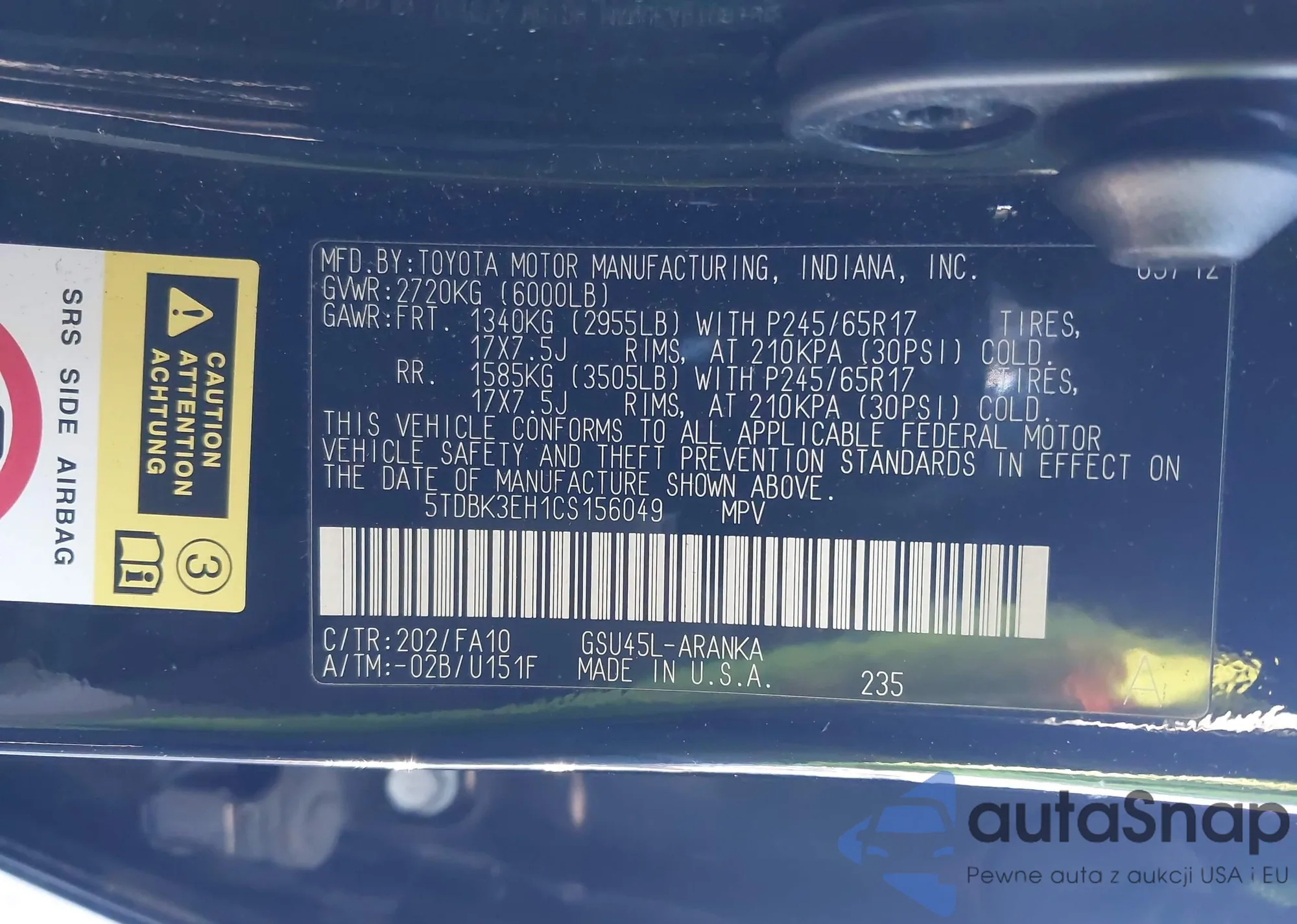 The car Toyota Highlander 2012 (VIN 5TDBK3EH1CS156049) has not been auctioned before. The documents are clean, and the mileage matches or is below the market average. Sold by an insurance company – we recommend purchase. Delivery to the port will take approx. 6–8 weeks.