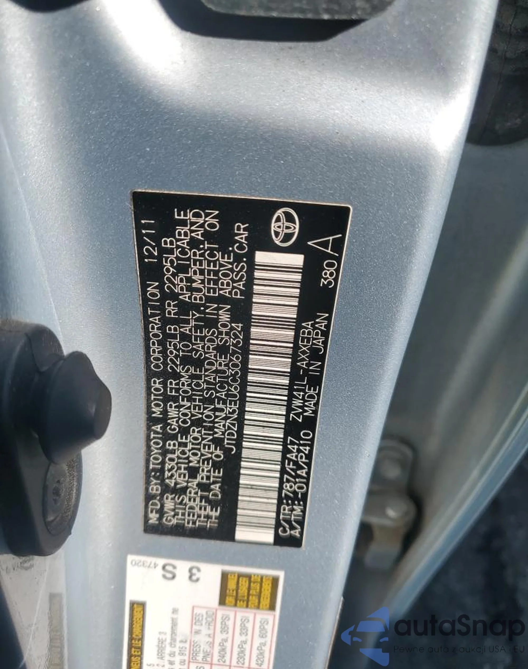 The car Toyota Prius v (+) 2012 (VIN JTDZN3EU6C3067324) has documents that prevent registration. Export and registration may be difficult. Contact AutaSnap experts to find alternatives.