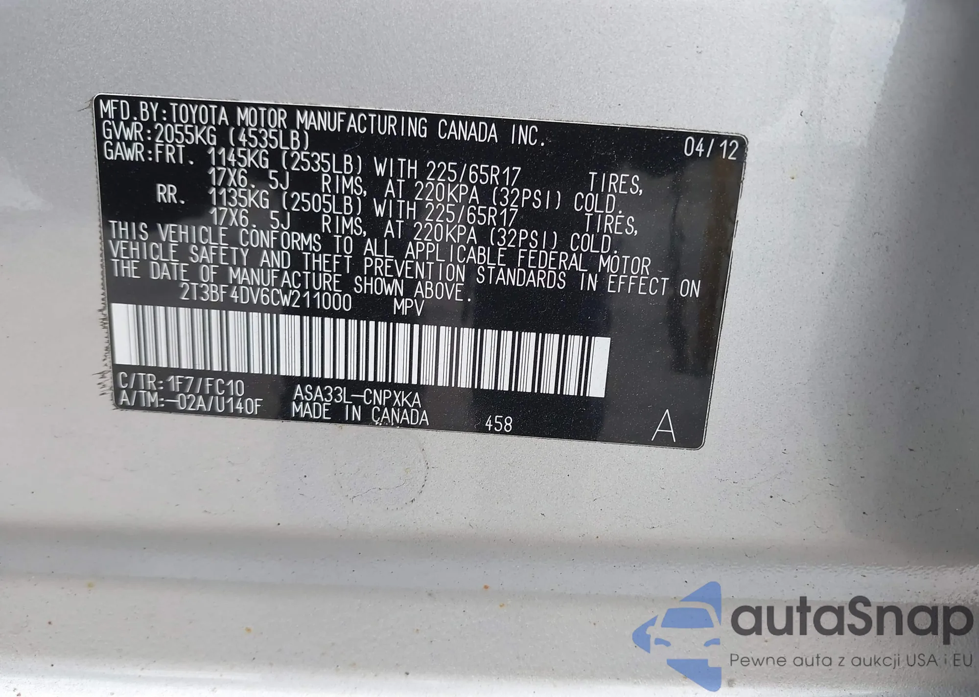 VIN: 2T3BF4DV6CW211000
