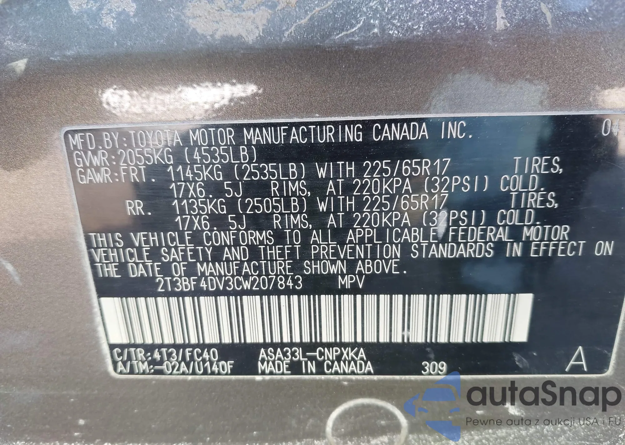 VIN: 2T3BF4DV3CW207843