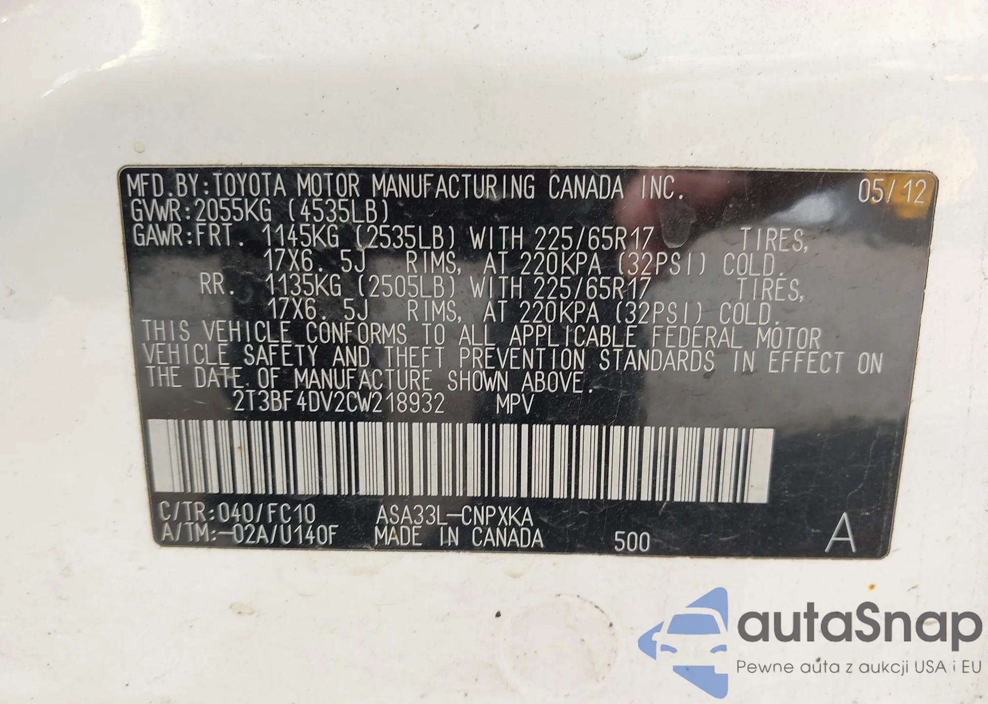 VIN: 2T3BF4DV2CW218932