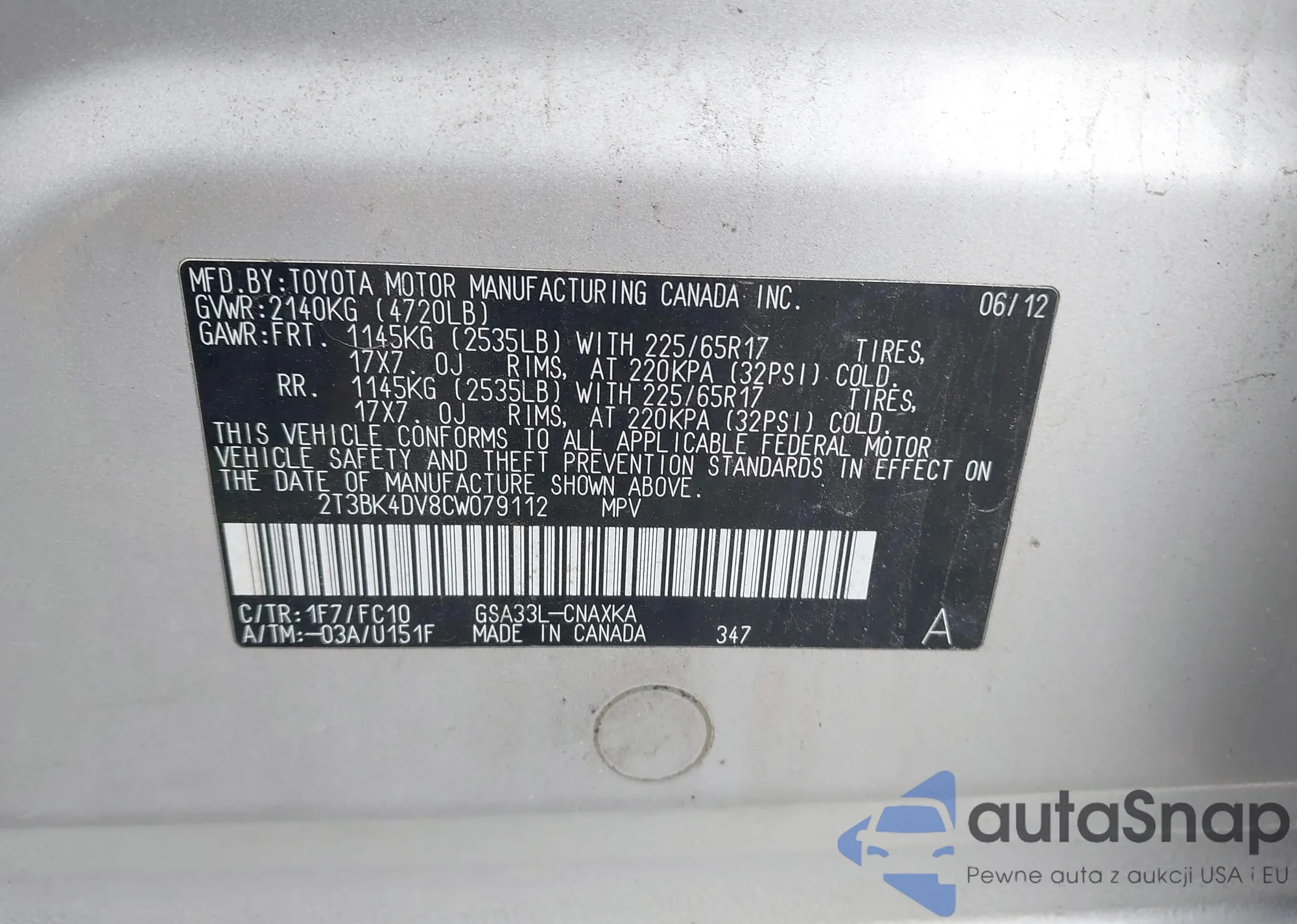 VIN: 2T3BK4DV8CW079112