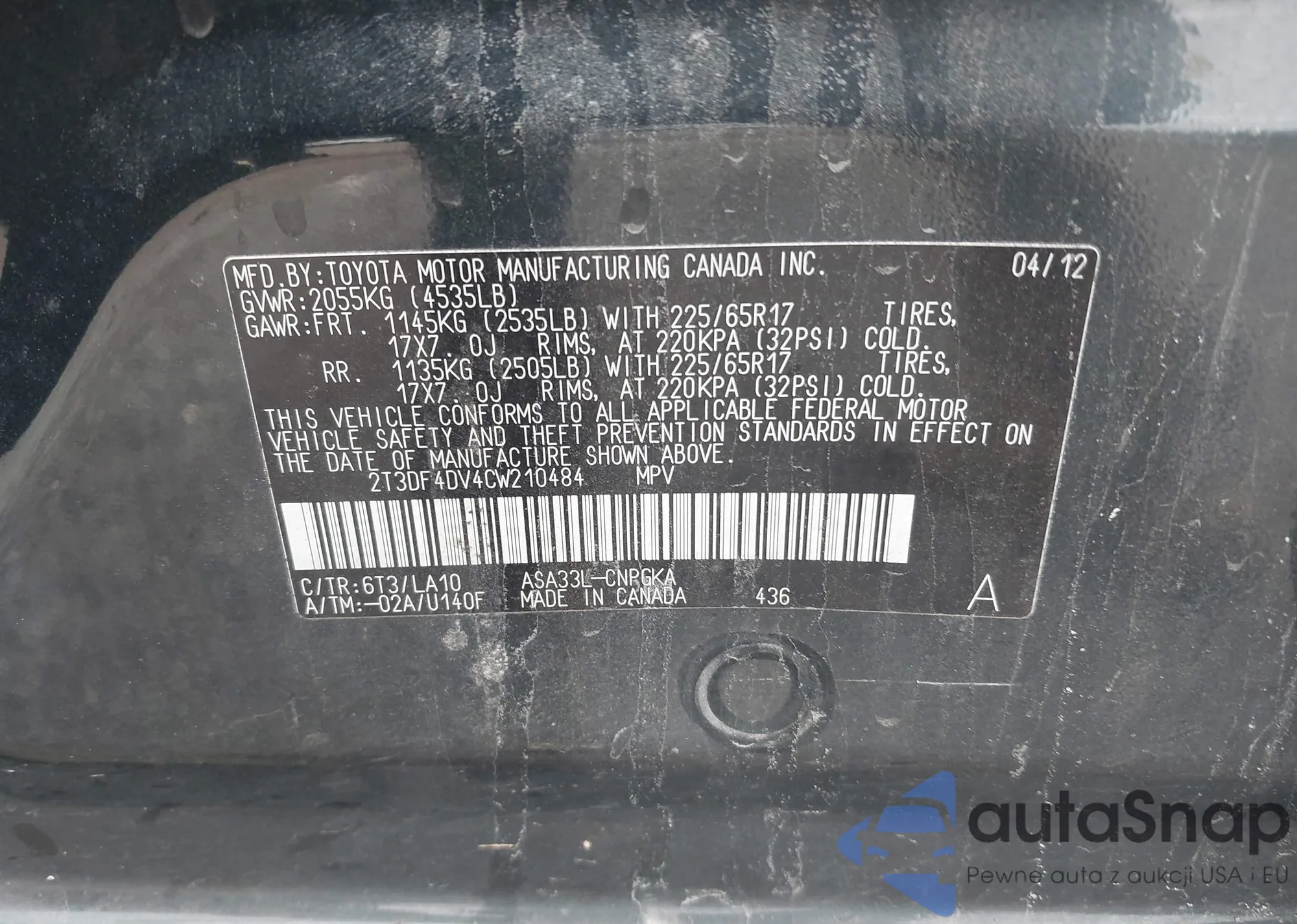 VIN: 2T3DF4DV4CW210484