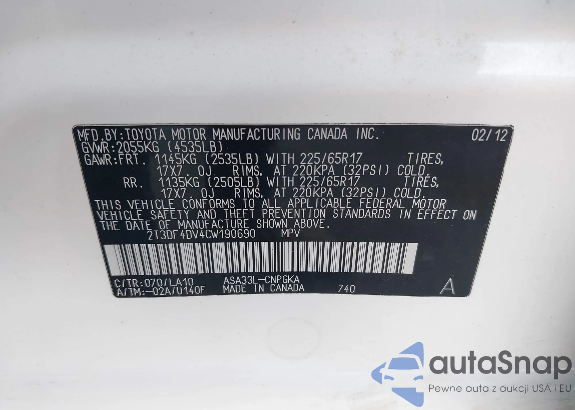 VIN: 2T3DF4DV4CW190690