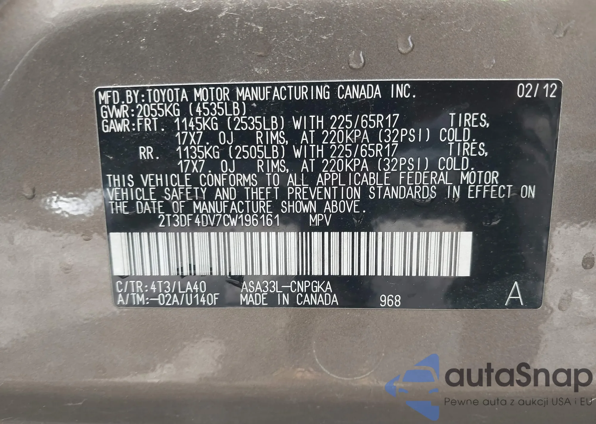 VIN: 2T3DF4DV7CW196161