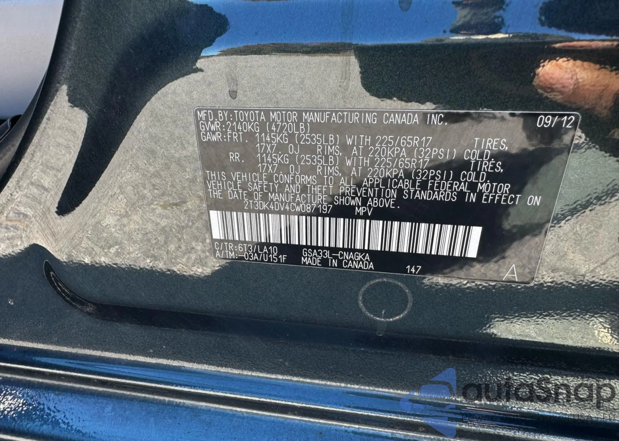 The car Toyota RAV 4 2012 (VIN 2T3DK4DV4CW087197) has documents that prevent registration. Export and registration may be difficult. Contact AutaSnap experts to find alternatives.