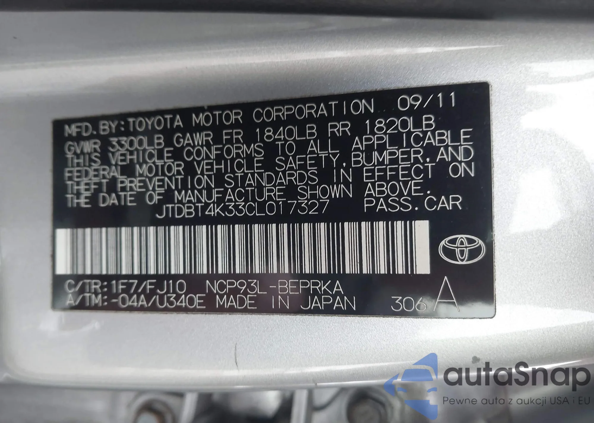 • VIN: JTDBT4K33CL017327