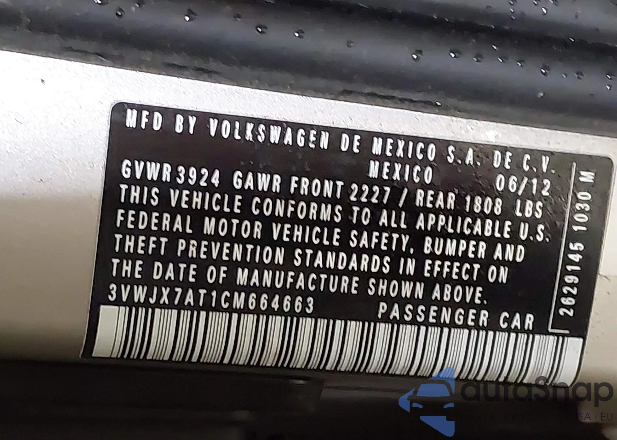 VIN: 3VWJX7AT1CM664663