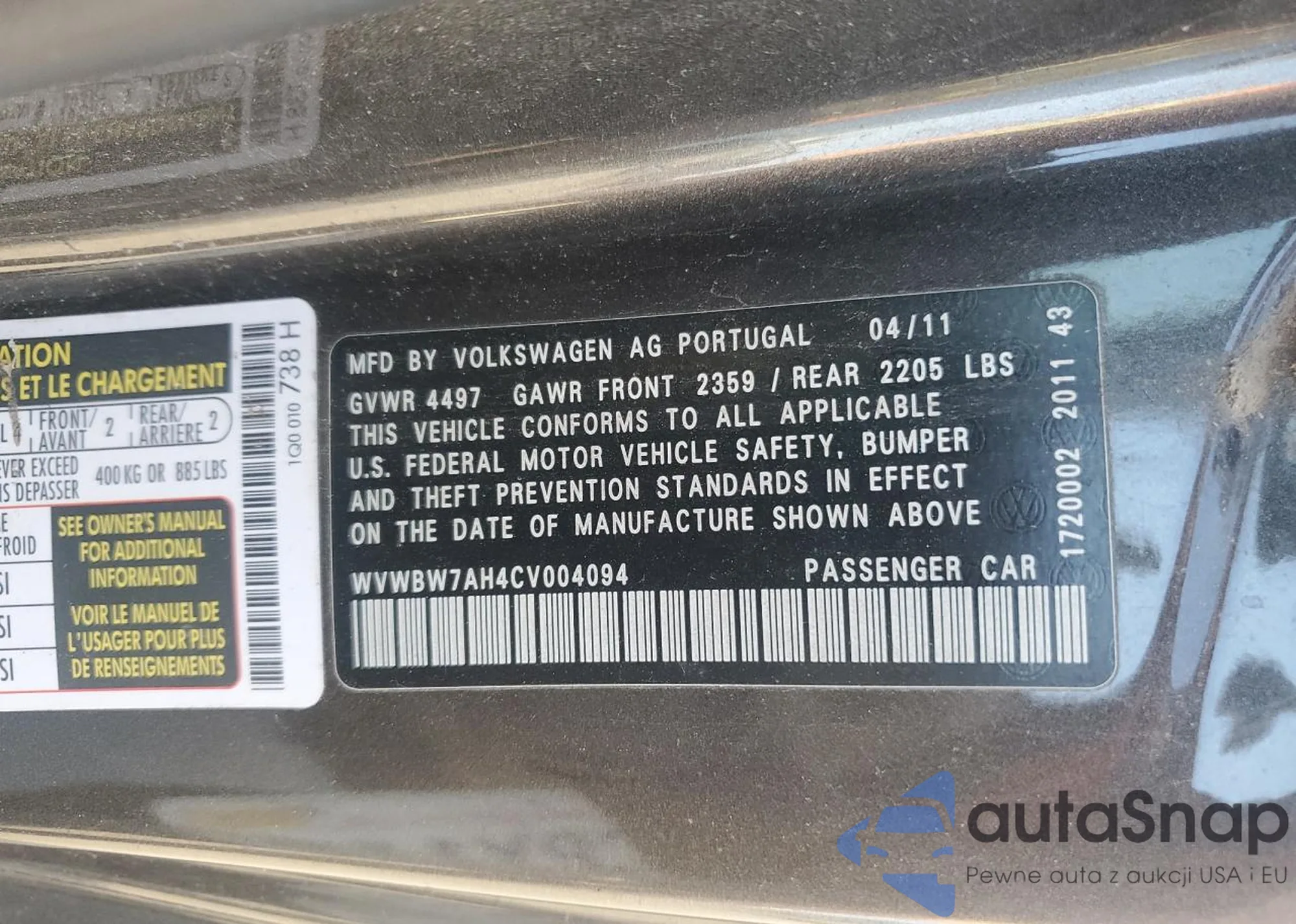 VIN: WVWBW7AH4CV004094