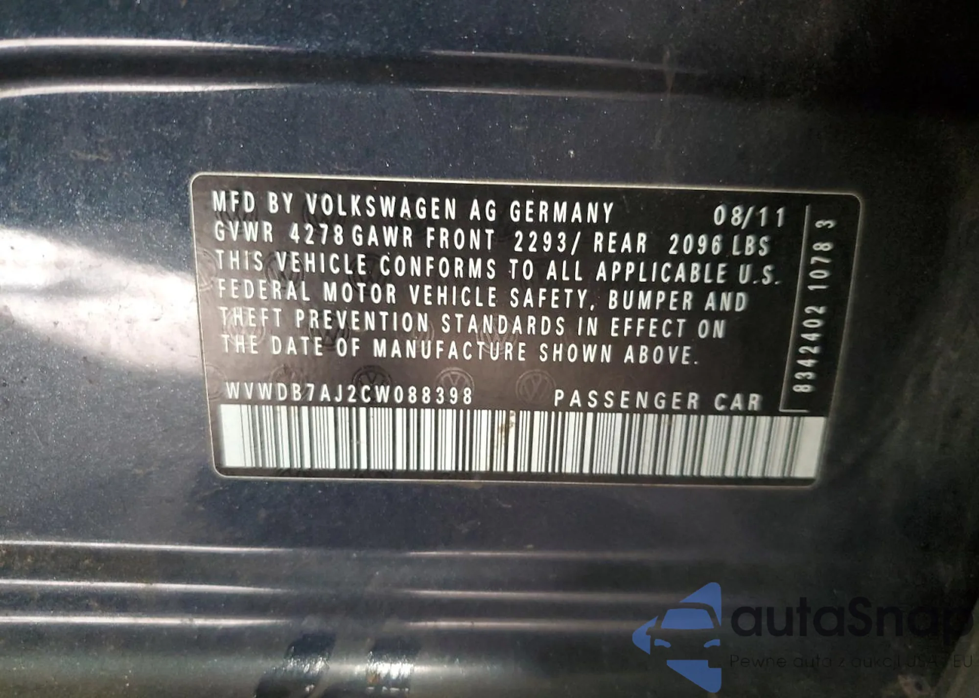 VIN: WVWDB7AJ2CW088398