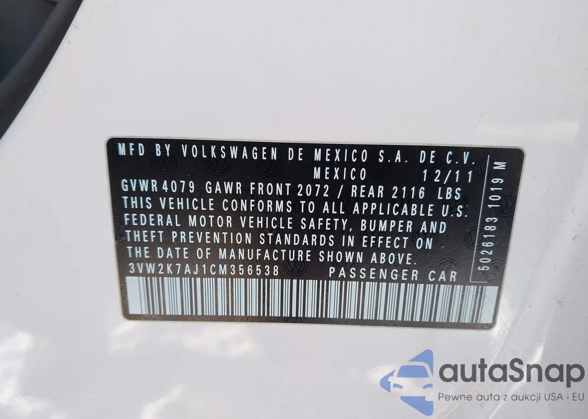 VIN: 3VW2K7AJ1CM356538
