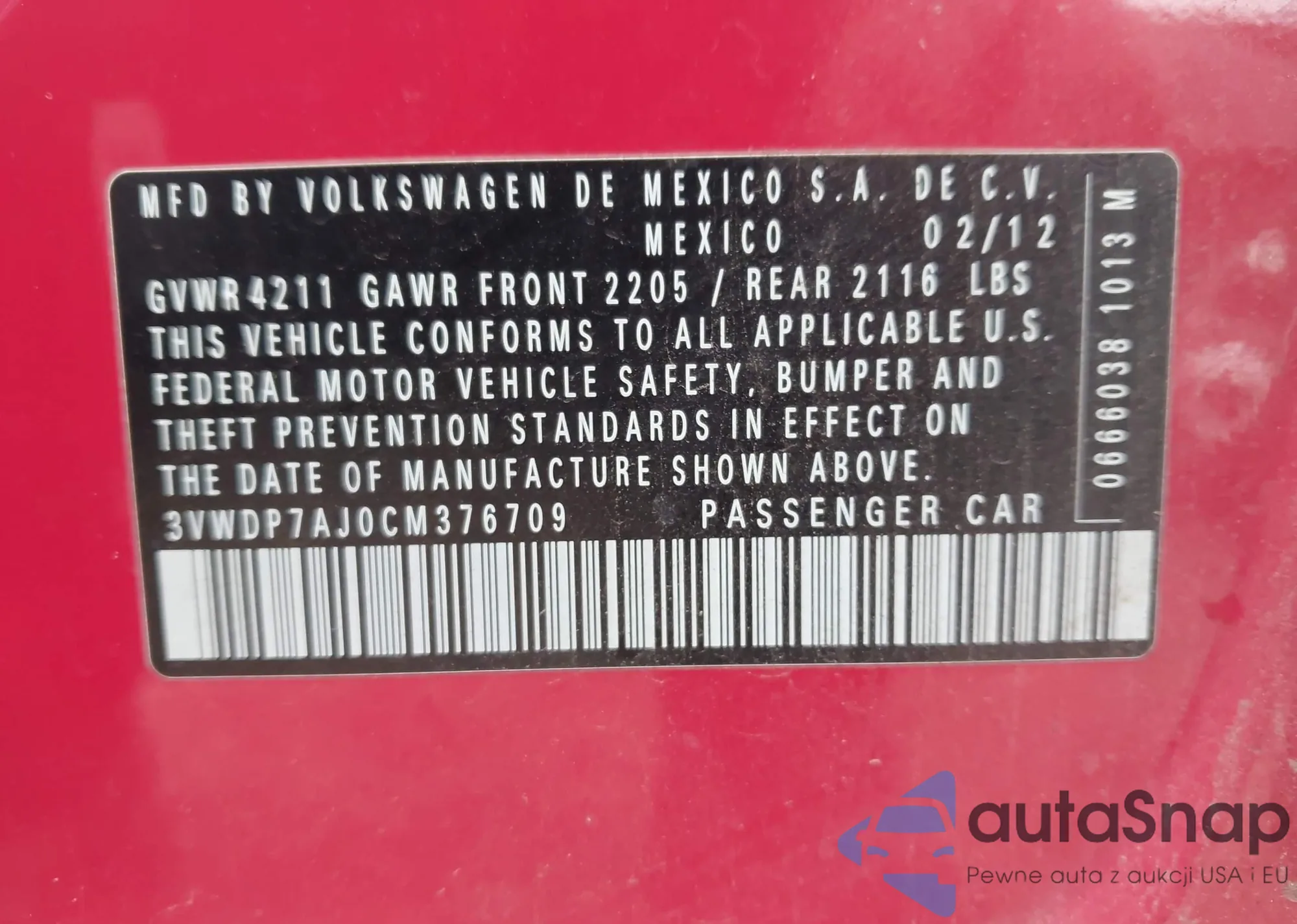 VIN: 3VWDP7AJ0CM376709