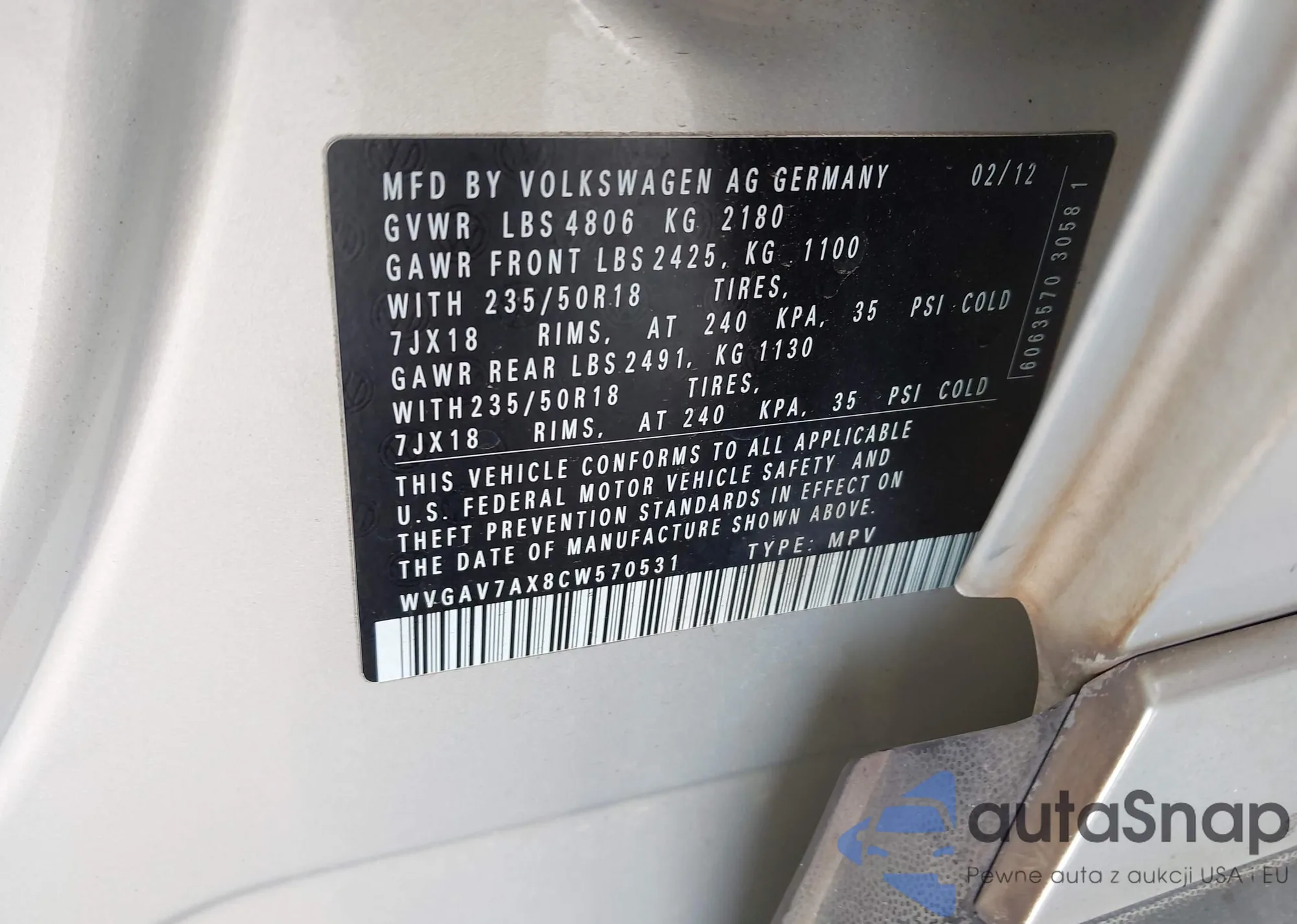 • VIN: WVGAV7AX8CW570531