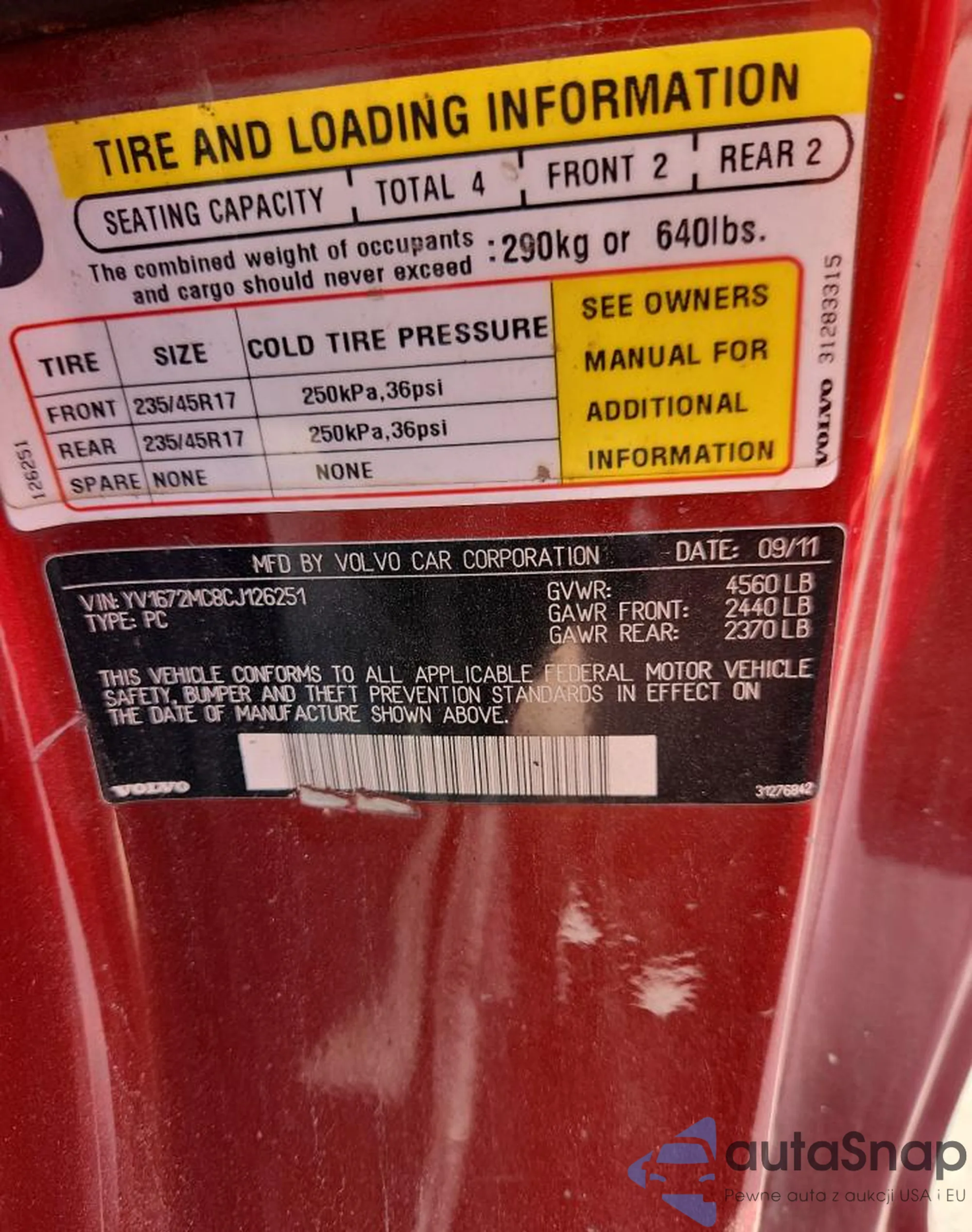 The car Volvo C70 2012 (VIN YV1672MC8CJ126251) has documents that prevent registration. Export and registration may be difficult. Contact AutaSnap experts to find alternatives.