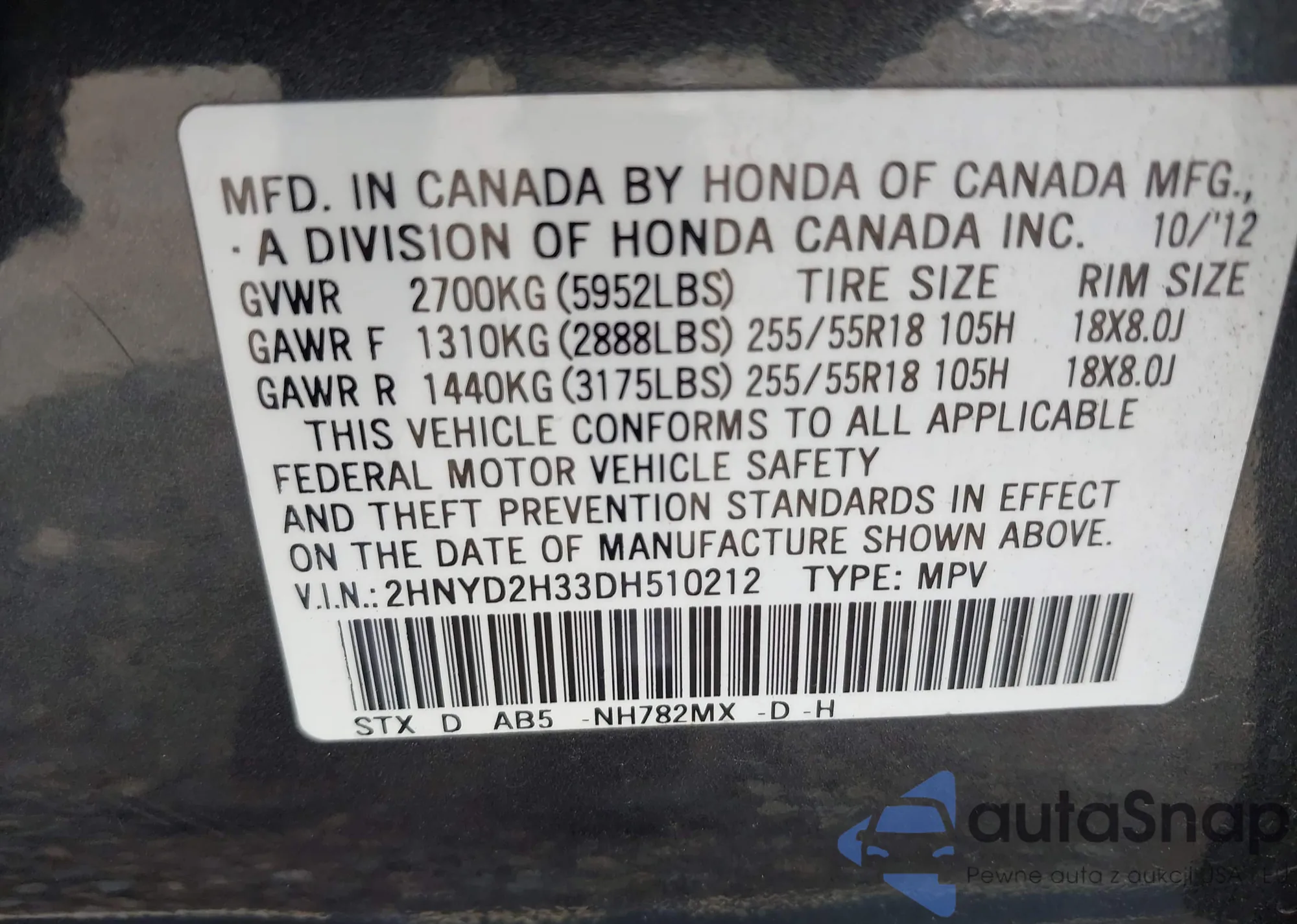 VIN: 2HNYD2H33DH510212