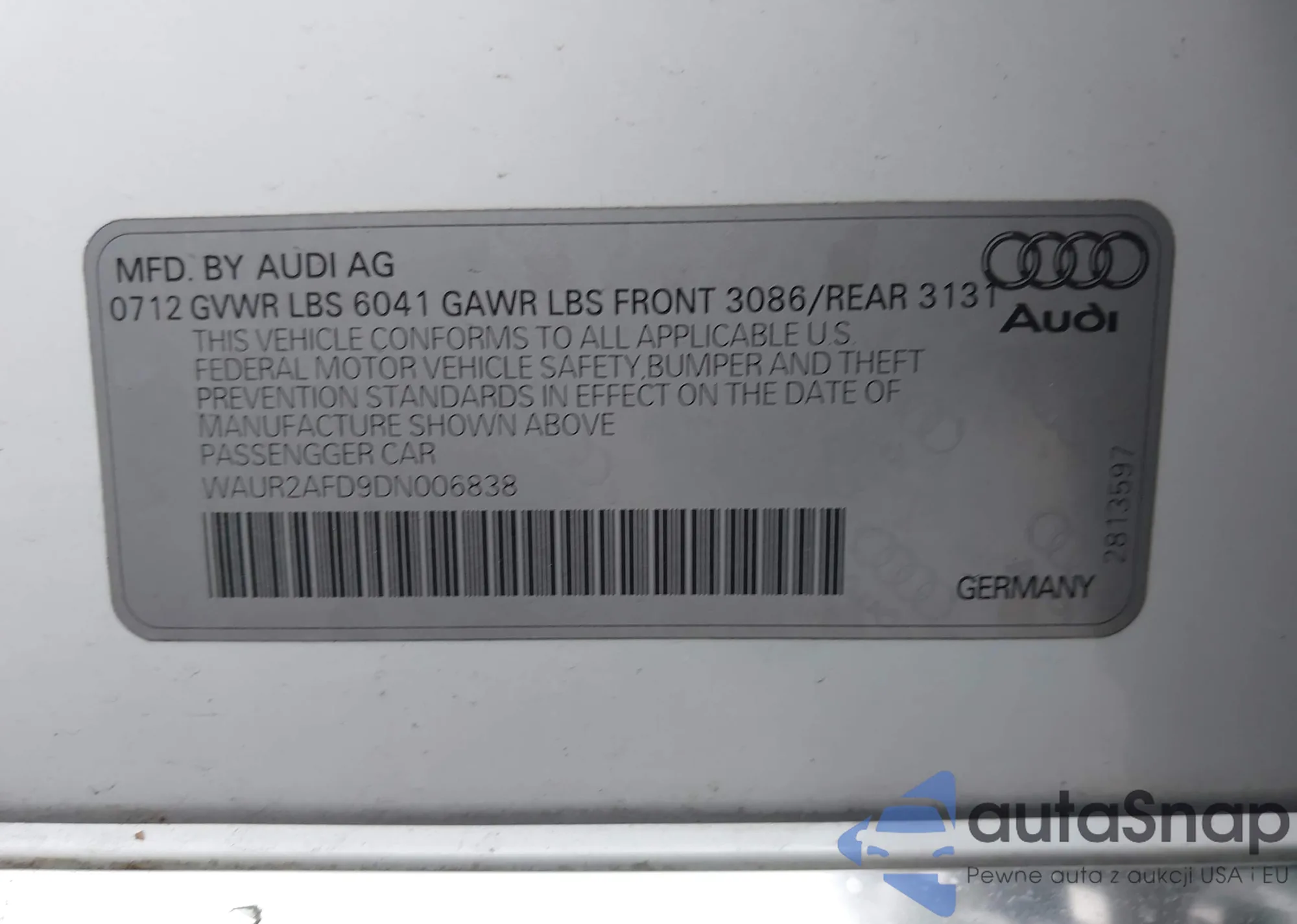 The car Audi A8 2013 (VIN WAUR2AFD9DN006838) has not been auctioned before. The documents are clean, and the mileage matches or is below the market average. Sold by an insurance company – we recommend purchase. Delivery to the port will take approx. 6–8 weeks.