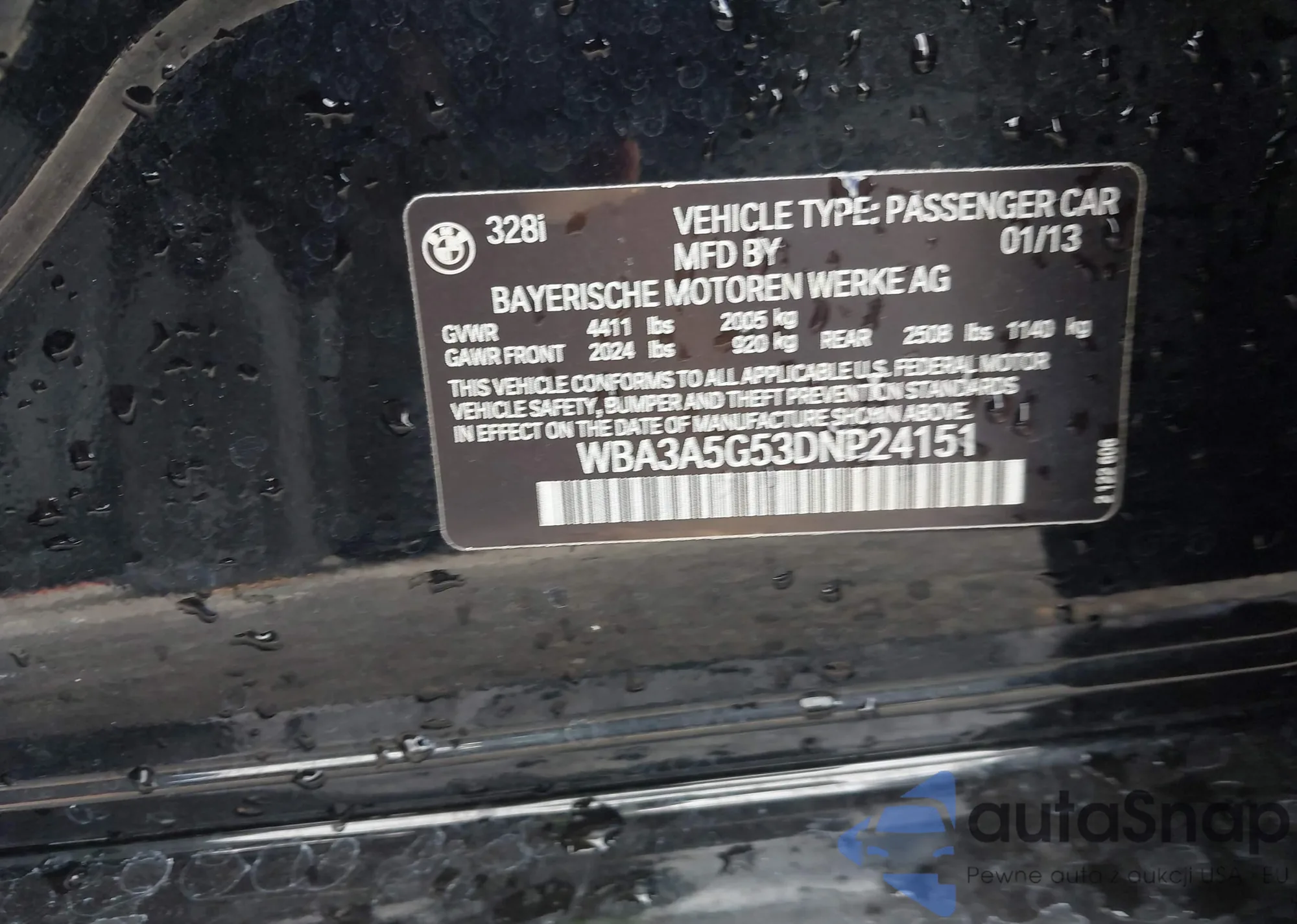 The car BMW 3er 2013 (VIN WBA3A5G53DNP24151) has not been auctioned before. The documents are clean, and the mileage matches or is below the market average. Sold by an insurance company – we recommend purchase. Delivery to the port will take approx. 6–8 weeks.