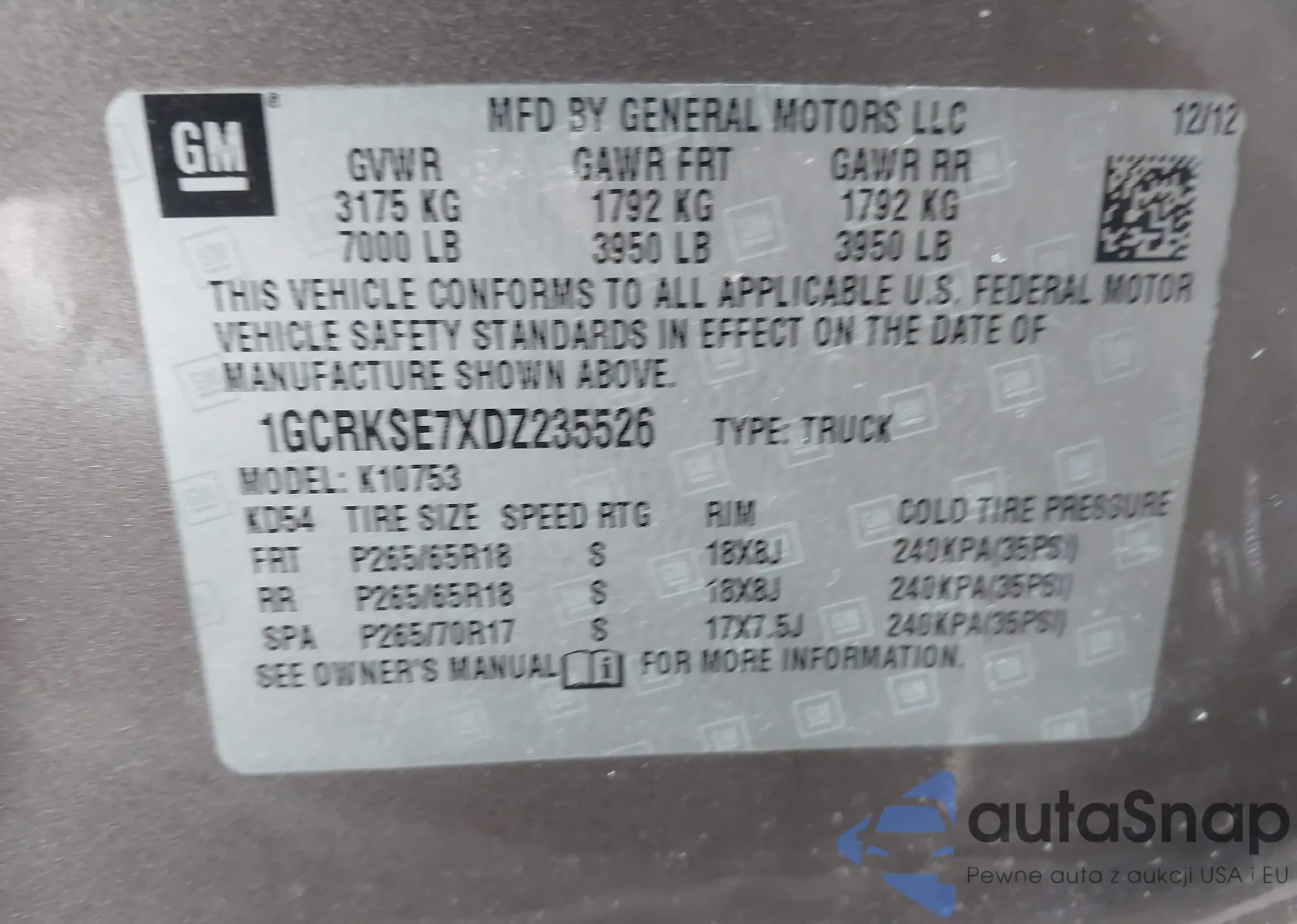 The car Chevrolet Silverado 2013 (VIN 1GCRKSE7XDZ235526) has not been auctioned before. The documents are clean, and the mileage matches or is below the market average. Sold by an insurance company – we recommend purchase. Delivery to the port will take approx. 6–8 weeks.