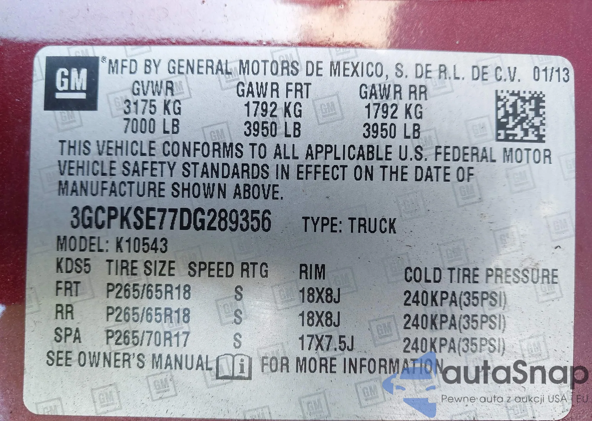 VIN: 3GCPKSE77DG289356