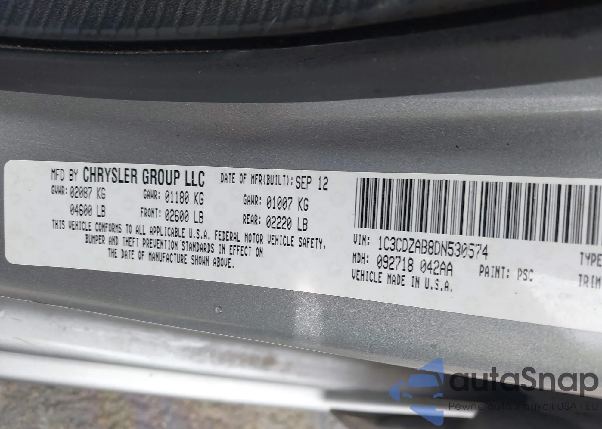 • VIN: 1C3CDZAB8DN530574