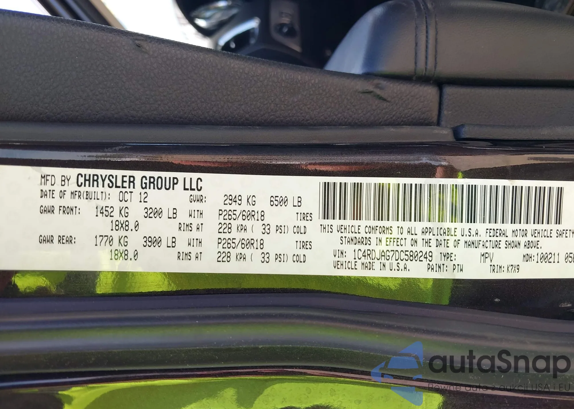 VIN: 1C4RDJAG7DC580249