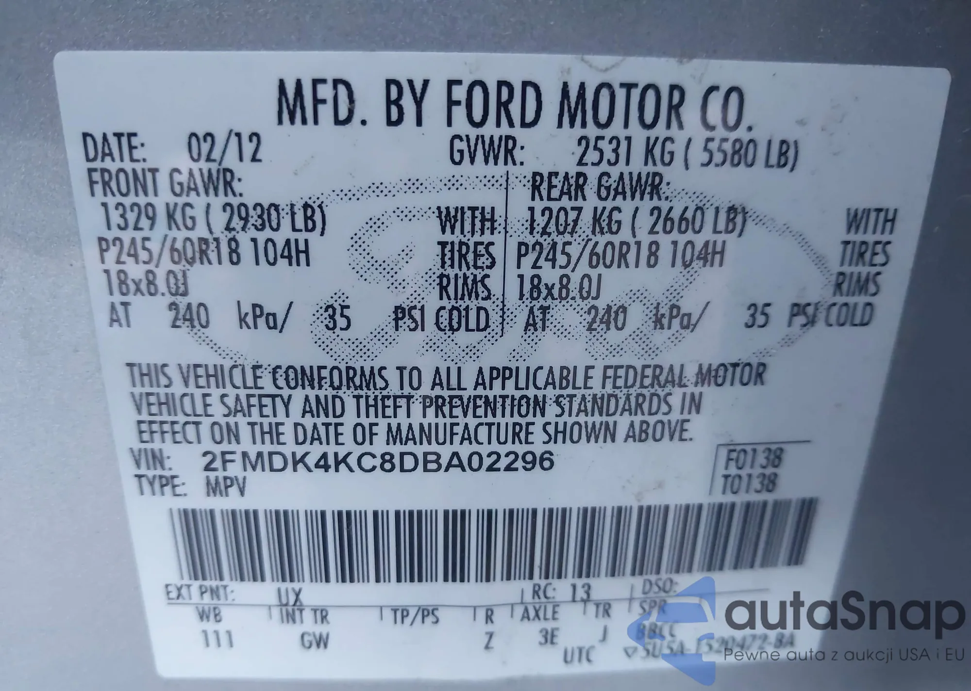 VIN: 2FMDK4KC8DBA02296