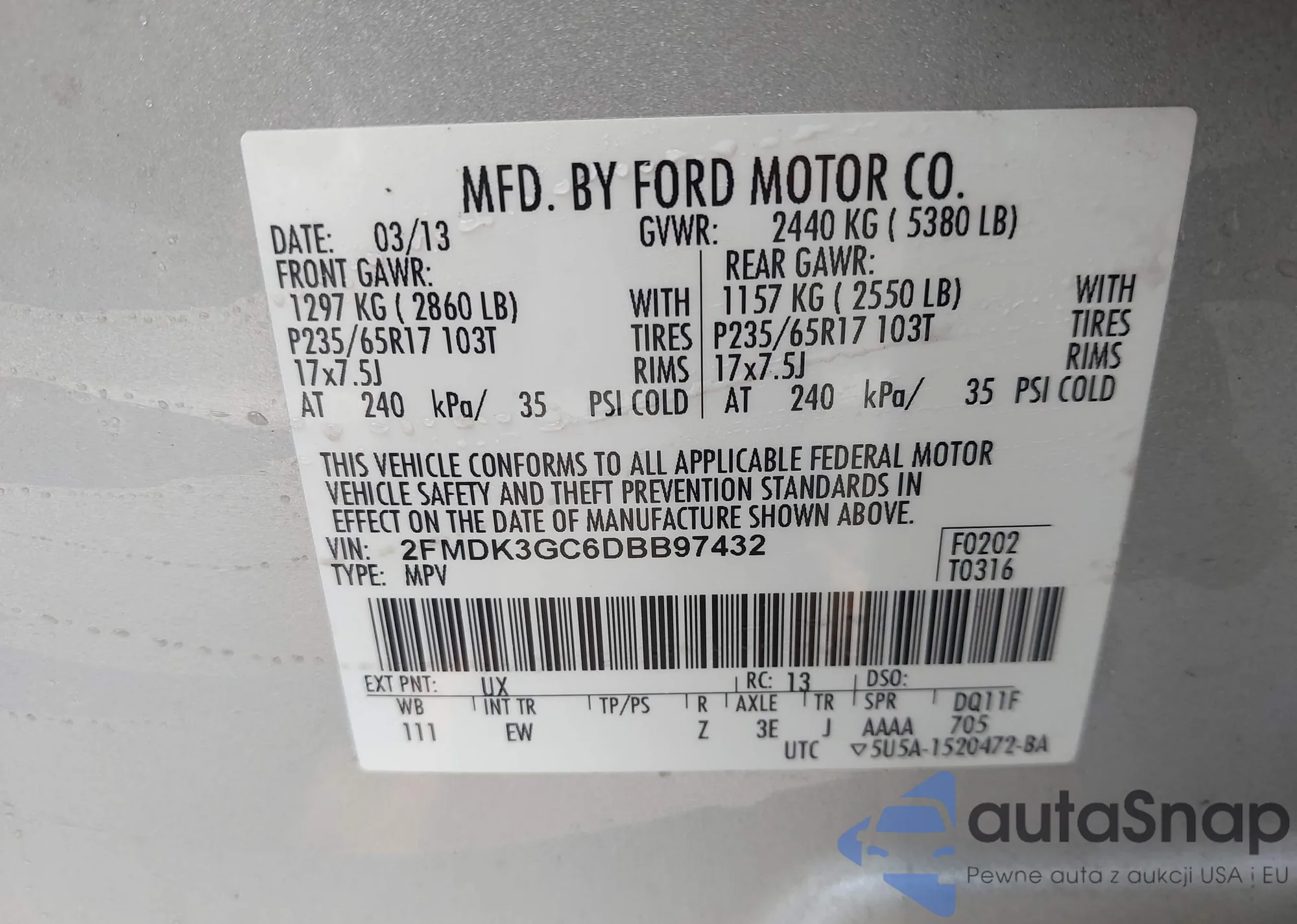 VIN: 2FMDK3GC6DBB97432