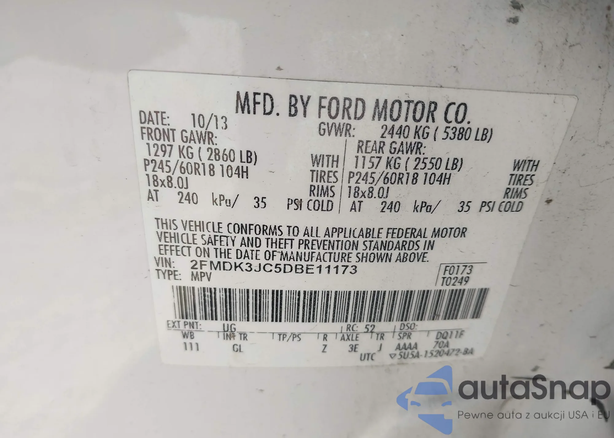 The car Ford Edge 2013 (VIN 2FMDK3JC5DBE11173) has not been auctioned before. The documents are clean, and the mileage matches or is below the market average. Sold by an insurance company – we recommend purchase. Delivery to the port will take approx. 6–8 weeks.