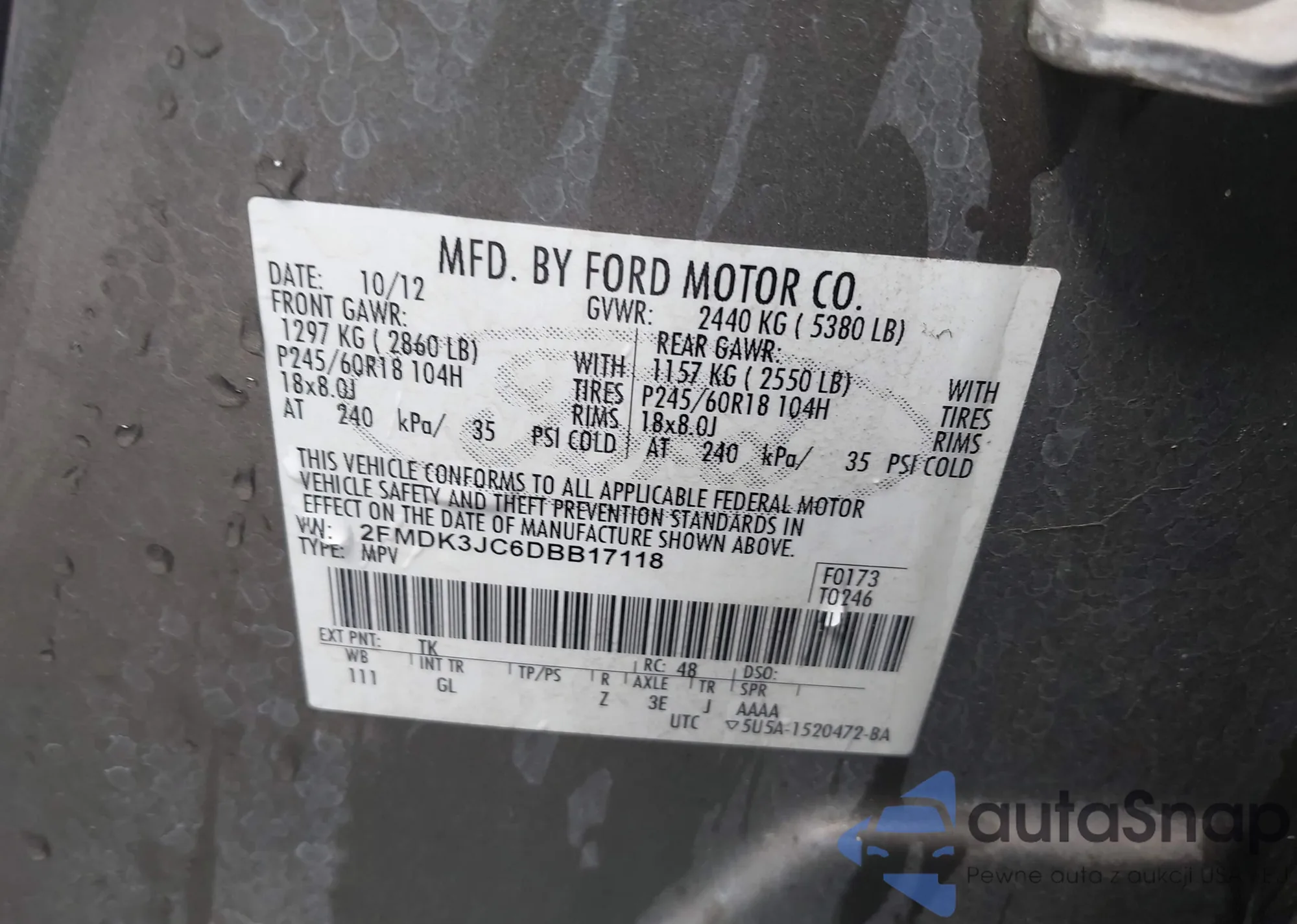 The car Ford Edge 2013 (VIN 2FMDK3JC6DBB17118) has not been auctioned before. The documents are clean, and the mileage matches or is below the market average. Sold by an insurance company – we recommend purchase. Delivery to the port will take approx. 6–8 weeks.