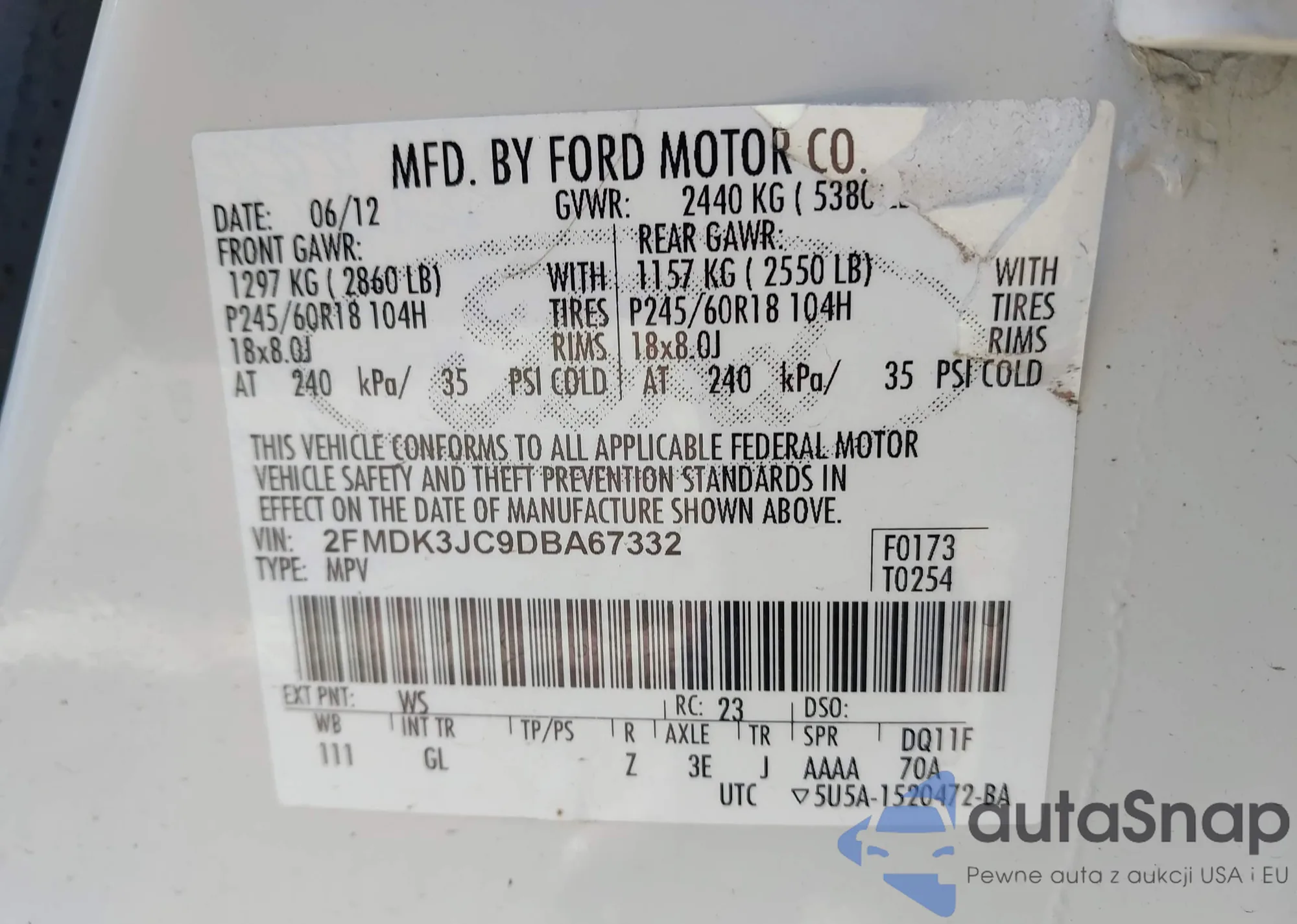 VIN: 2FMDK3JC9DBA67332