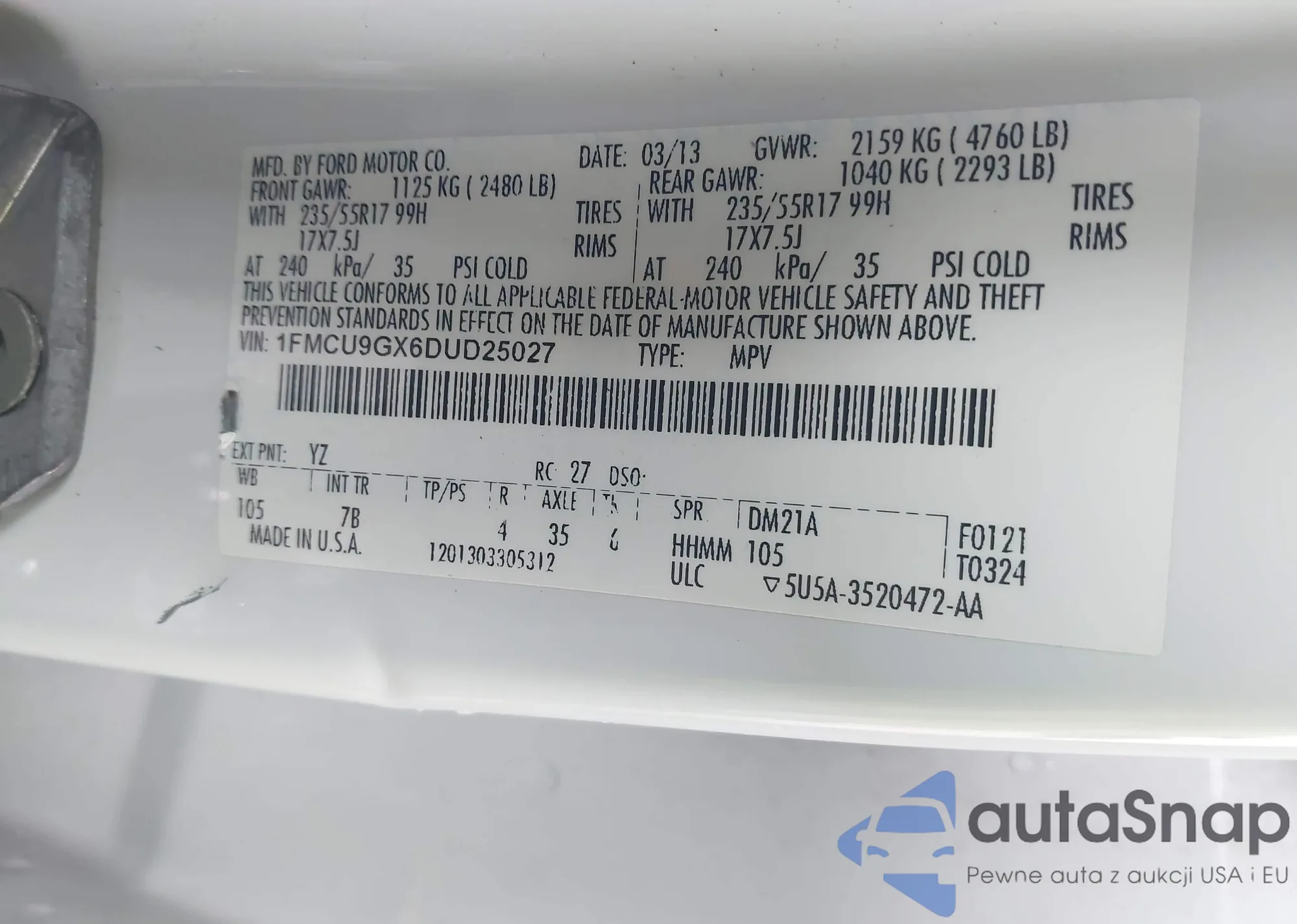 VIN: 1FMCU9GX6DUD25027
