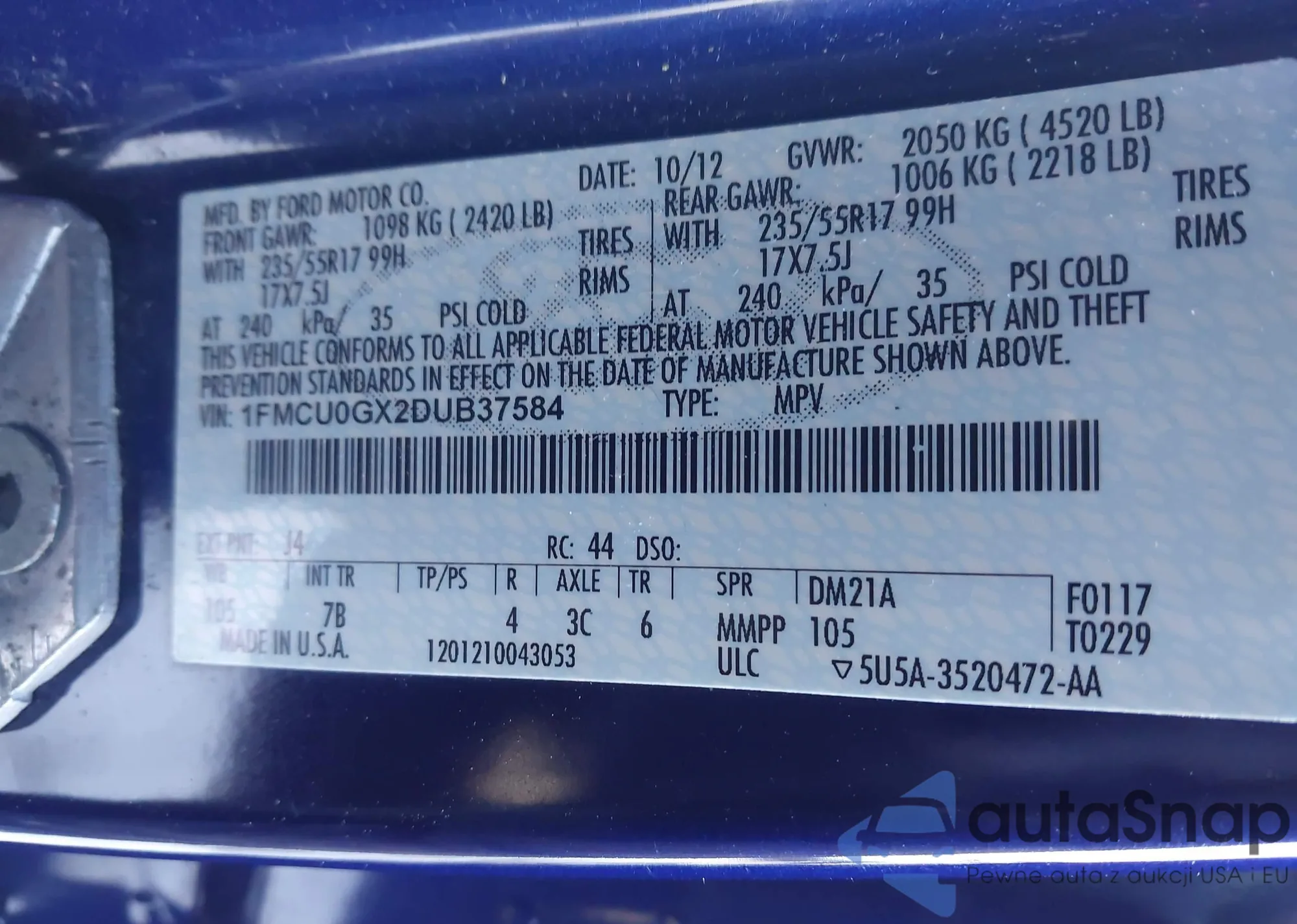 The car Ford Escape 2013 (VIN 1FMCU0GX2DUB37584) has not been auctioned before. The documents are clean, and the mileage matches or is below the market average. Sold by an insurance company – we recommend purchase. Delivery to the port will take approx. 6–8 weeks.