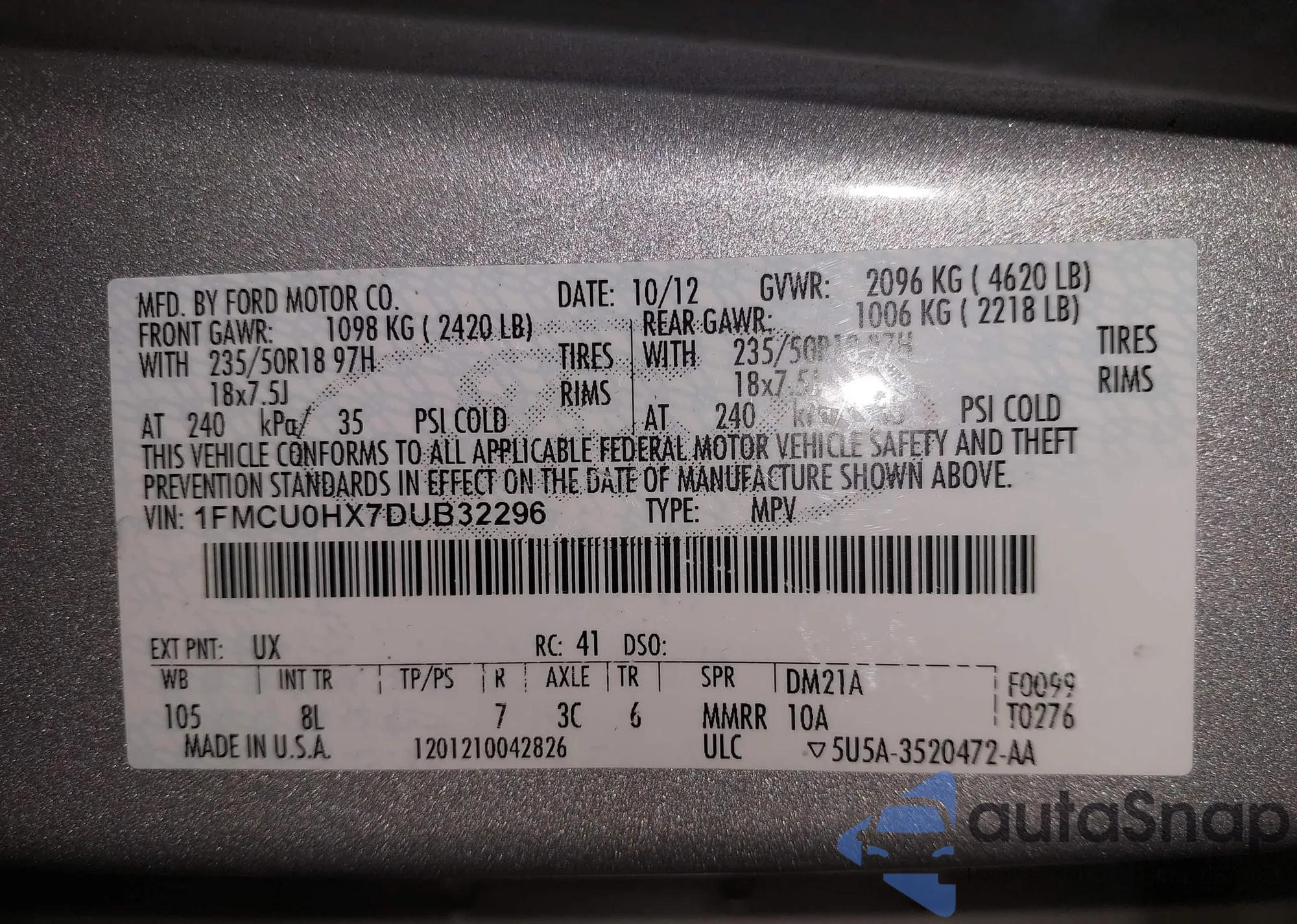 VIN: 1FMCU0HX7DUB32296
