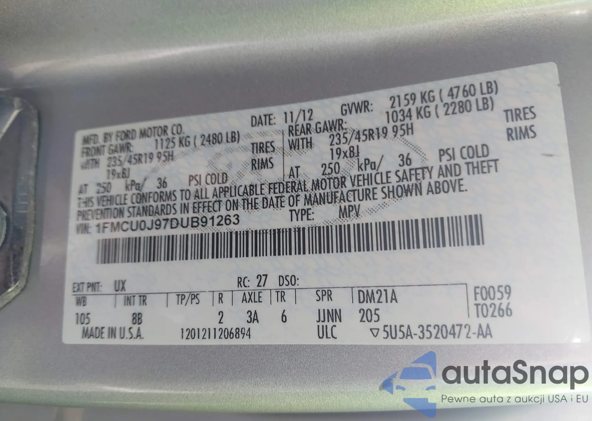 VIN: 1FMCU0J97DUB91263