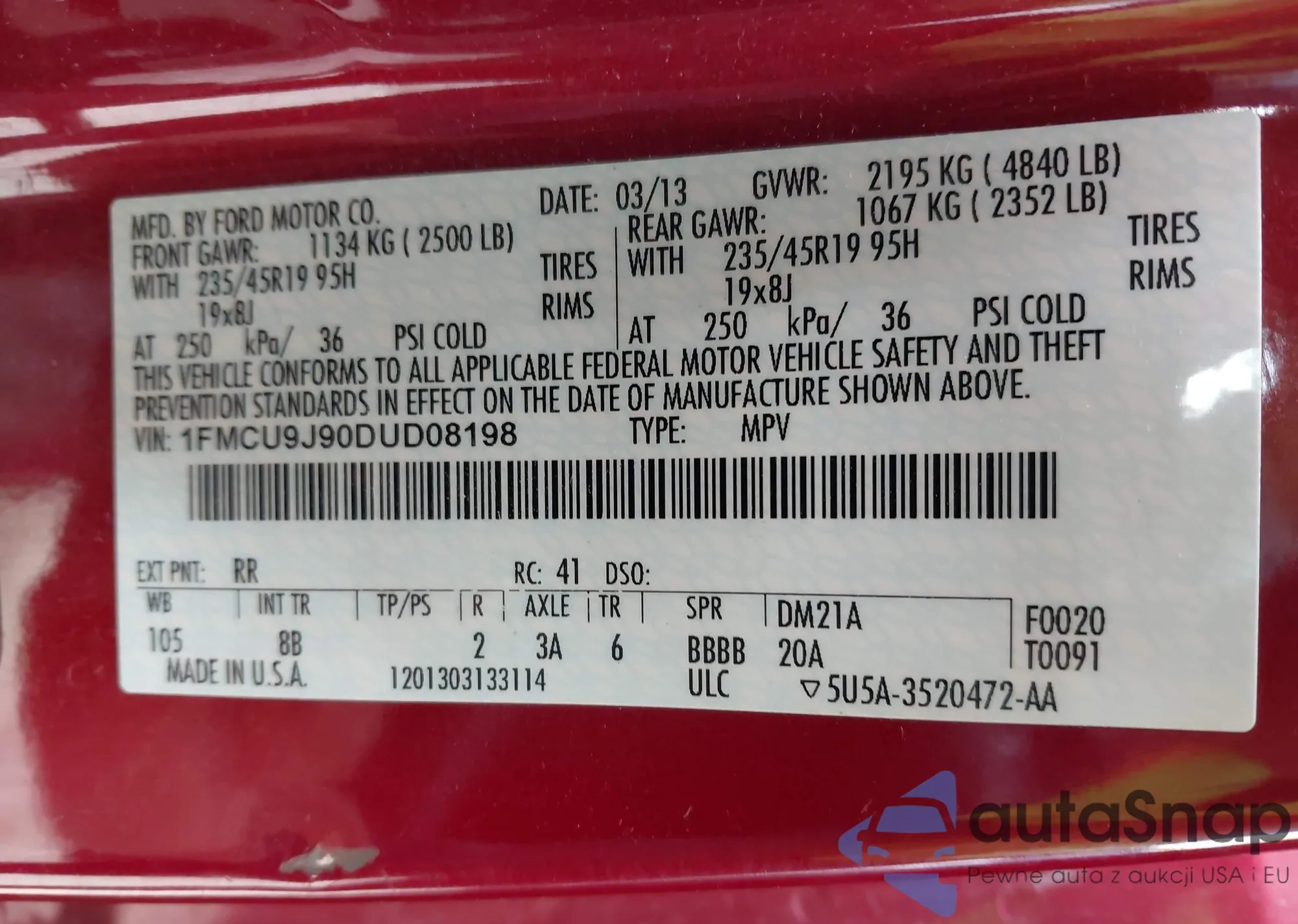 VIN: 1FMCU9J90DUD08198