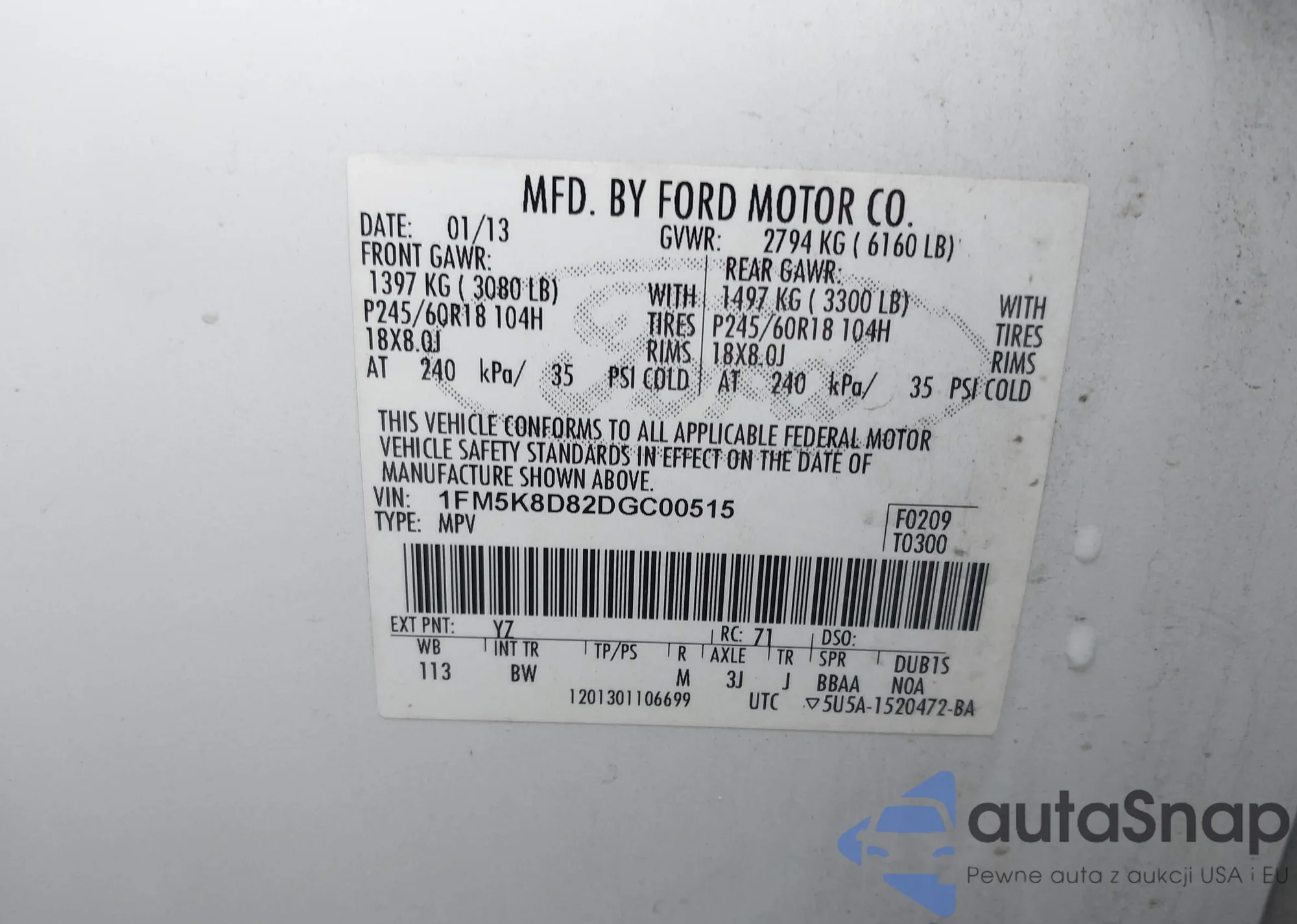 The car Ford Explorer 2013 (VIN 1FM5K8D82DGC00515) has not been auctioned before. The documents are clean, and the mileage matches or is below the market average. Sold by an insurance company – we recommend purchase. Delivery to the port will take approx. 6–8 weeks.
