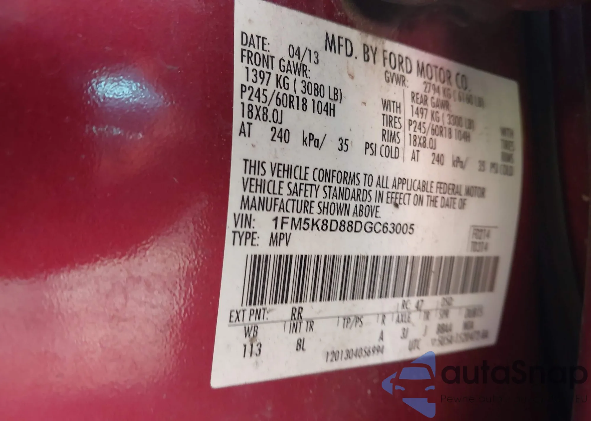 VIN: 1FM5K8D88DGC63005