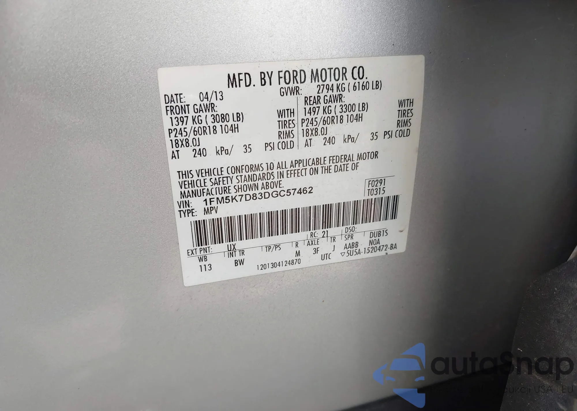VIN: 1FM5K7D83DGC57462