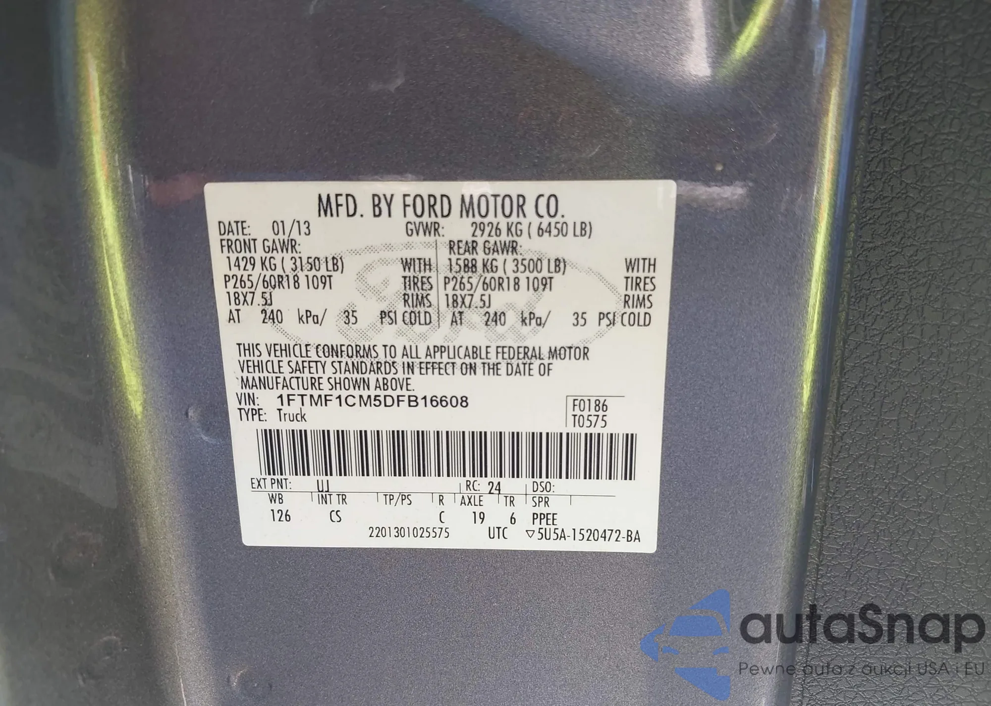 The car Ford F-150 2013 (VIN 1FTMF1CM5DFB16608) has not been auctioned before. The documents are clean, and the mileage matches or is below the market average. Sold by an insurance company – we recommend purchase. Delivery to the port will take approx. 6–8 weeks.